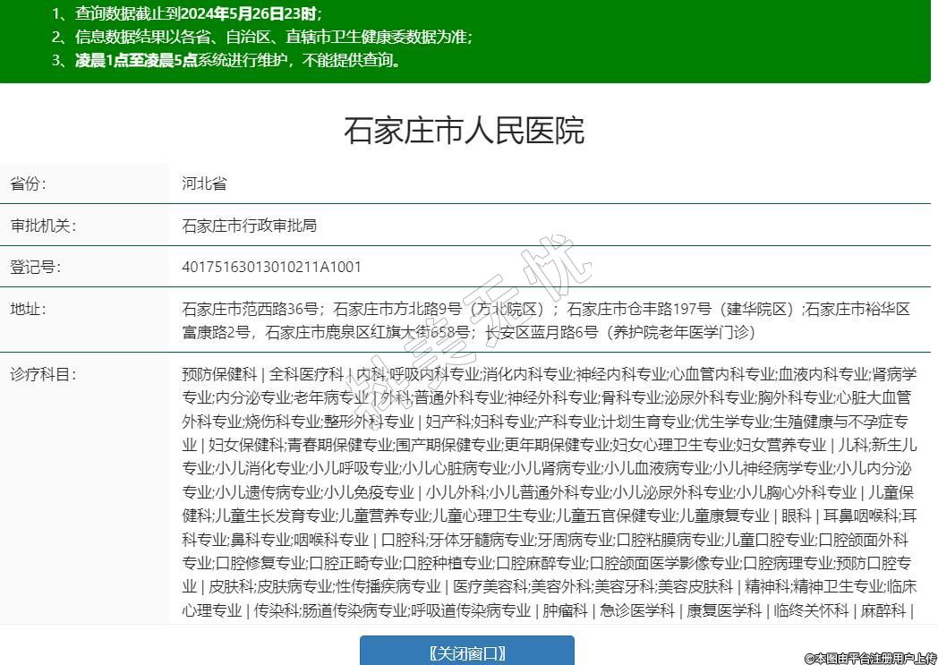 石家莊市范西路36號;石家莊市方北路9號(方北院區(qū));石家莊市倉豐路197號(建華院區(qū));石家莊市裕華區(qū)富康路2號,石家莊市鹿泉區(qū)紅旗大街658號;長安區(qū)藍(lán)月路6號(養(yǎng)護(hù)院老年醫(yī)學(xué)門診)