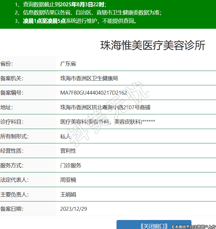 省份:廣東省備案機(jī)關(guān):珠海市香洲區(qū)衛(wèi)生健康局備案編號(hào):MA7F80GU444040217D2162地址:珠海市香洲區(qū)拱北粵海中路2107號(hào)商鋪診療科目:醫(yī)療美容科(美容外科,美容皮膚科)******所有制形式:私人經(jīng)營(yíng)性質(zhì):營(yíng)利性服務(wù)方式:門診服務(wù)法定代表人:周亞楠主要負(fù)責(zé)人:王娟娟備案日期:2023/12/29 -