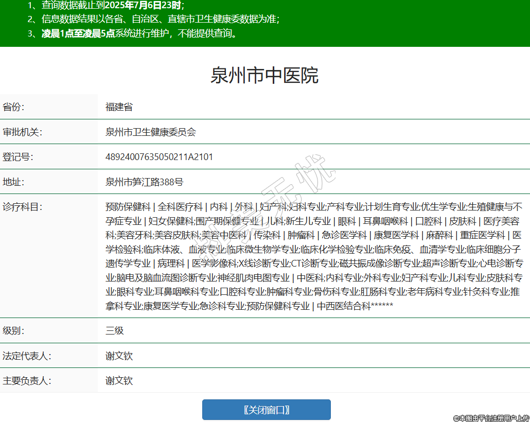 省份:福建省審批機(jī)關(guān):泉州市衛(wèi)生健康委員會(huì)登記號(hào):48924007635050211A2101地址:泉州市筍江路388號(hào)診療科目:預(yù)防保健科 | 全科醫(yī)療科 | 內(nèi)科 | 外科 | 婦產(chǎn)科;婦科專業(yè);產(chǎn)科專業(yè);計(jì)劃生育專業(yè);優(yōu)生學(xué)專業(yè);生殖健康與不孕癥專業(yè) | 婦女保健科;圍產(chǎn)期保健專業(yè) | 兒科;新生兒專業(yè) | 眼科 | 耳鼻咽喉科 | 口腔科 | 皮膚科 | 醫(yī)療美容科;美容牙科;美容皮膚科;美容中醫(yī)科 | 傳染科 | 腫瘤科 | 急診醫(yī)學(xué)科 | 康復(fù)醫(yī)學(xué)科 | 麻醉科 | 重癥醫(yī)學(xué)科 | 醫(yī)學(xué)檢驗(yàn)科;臨床體液、血液專業(yè);臨床微生物學(xué)專業(yè);臨床化學(xué)檢驗(yàn)專業(yè);臨床免疫、血清學(xué)專業(yè);臨床細(xì)胞分子遺傳學(xué)專業(yè) | 病理科 | 醫(yī)學(xué)影像科;X線診斷專業(yè);CT診斷專業(yè);磁共振成像診斷專業(yè);超聲診斷專業(yè);心電診斷專業(yè);腦電及腦血流圖診斷專業(yè);神經(jīng)肌肉電圖專業(yè) | 中醫(yī)科;內(nèi)科專業(yè);外科專業(yè);婦產(chǎn)科專業(yè);兒科專業(yè);皮膚科專業(yè);眼科專業(yè);耳鼻咽喉科專業(yè);口腔科專業(yè);腫瘤科專業(yè);骨傷科專業(yè);肛腸科專業(yè);老年病科專業(yè);針灸科專業(yè);推拿科專業(yè);康復(fù)醫(yī)學(xué)專業(yè);急診科專業(yè);預(yù)防保健科專業(yè) | 中西醫(yī)結(jié)合科******級(jí)別:三級(jí)法定代表人:謝文欽主要負(fù)責(zé)人:謝文欽執(zhí)業(yè)許可證有效期:2022/07/22 -至- 2028/07/21 -