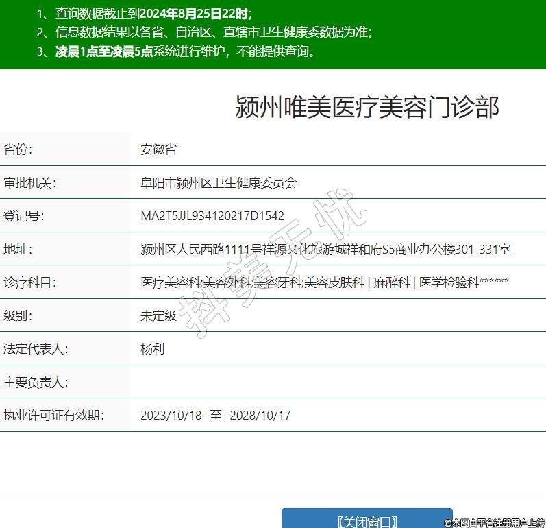 潁州唯美醫(yī)療美容門診部,診療科目:醫(yī)療美容科;美容外科;美容牙科;美容皮膚科 | 麻醉科 | 醫(yī)學(xué)檢驗科******