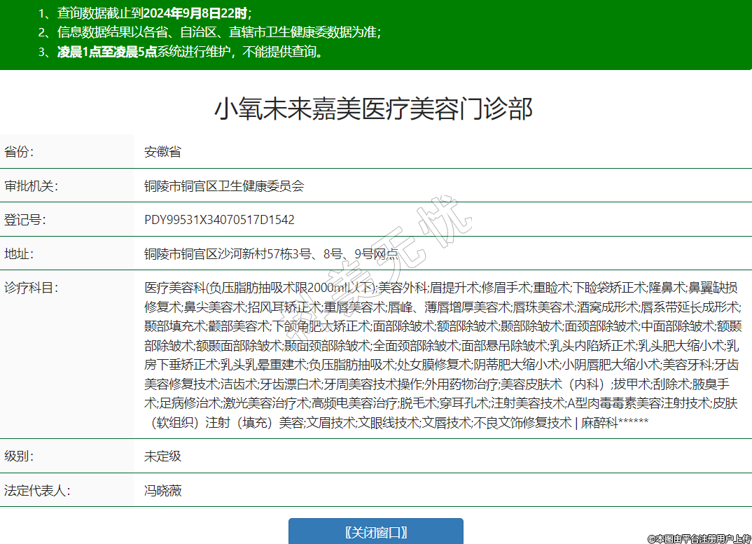 醫(yī)療美容科(負壓脂肪抽吸術(shù)限2000ml以下);美容外科;眉提升術(shù);修眉手術(shù);重瞼術(shù);下瞼袋矯正術(shù);隆鼻術(shù);鼻翼缺損修復(fù)術(shù);鼻尖美容術(shù);招風耳矯正術(shù);重唇美容術(shù);唇峰、薄唇增厚美容術(shù);唇珠美容術(shù);酒窩成形術(shù);唇系帶延長成形術(shù);顳部填充術(shù);顴部美容術(shù);下頜角肥大矯正術(shù);面部除皺術(shù);額部除皺術(shù);顳部除皺術(shù);面頸部除皺術(shù);中面部除皺術(shù);額顳部除皺術(shù);額顳面部除皺術(shù);顳面頸部除皺術(shù);全面頸部除皺術(shù);面部懸吊除皺術(shù);乳頭內(nèi)陷矯正術(shù);乳頭肥大縮小術(shù);乳房下垂矯正術(shù);乳頭乳暈重建術(shù);負壓脂肪抽吸術(shù);處女膜修復(fù)術(shù);陰蒂肥大縮小術(shù);小陰唇肥大縮小術(shù);美容牙科;牙齒美容修復(fù)技術(shù);潔齒術(shù);牙齒漂白術(shù);牙周美容技術(shù)操作;外用藥物治療;美容皮膚術(shù)(內(nèi)科);拔甲術(shù);刮除術(shù);腋臭手術(shù);足病修治術(shù);激光美容治療術(shù);高頻電美容治療;脫毛術(shù);穿耳孔術(shù);注射美容技術(shù);A型肉毒毒素美容注射技術(shù);皮膚(軟組織)注射(填充)美容;文眉技術(shù);文眼線技術(shù);文唇技術(shù);不良文飾修復(fù)技術(shù) | 麻醉科******