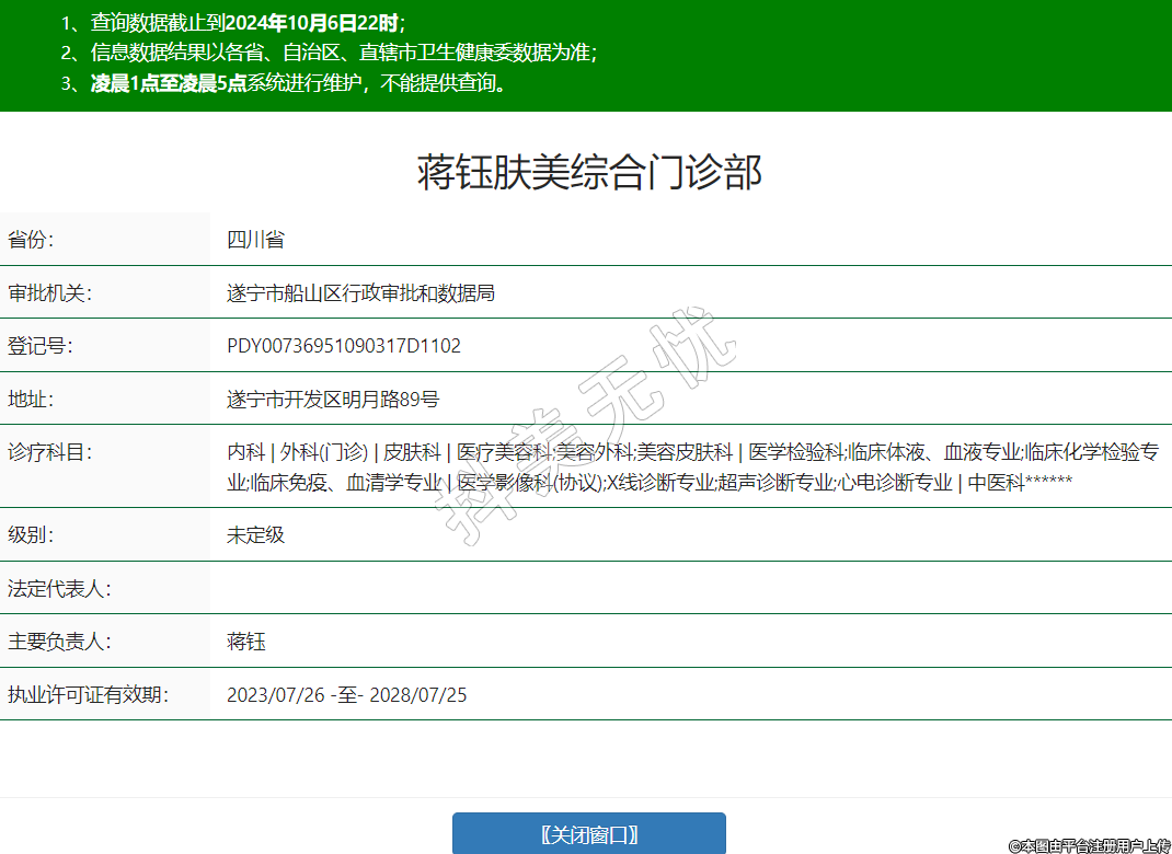 內科 | 外科(門診) | 皮膚科 | 醫(yī)療美容科;美容外科;美容皮膚科 | 醫(yī)學檢驗科;臨床體液、血液專業(yè);臨床化學檢驗專業(yè);臨床免疫、血清學專業(yè) | 醫(yī)學影像科(協(xié)議);X線診斷專業(yè);超聲診斷專業(yè);心電診斷專業(yè) | 中醫(yī)科******