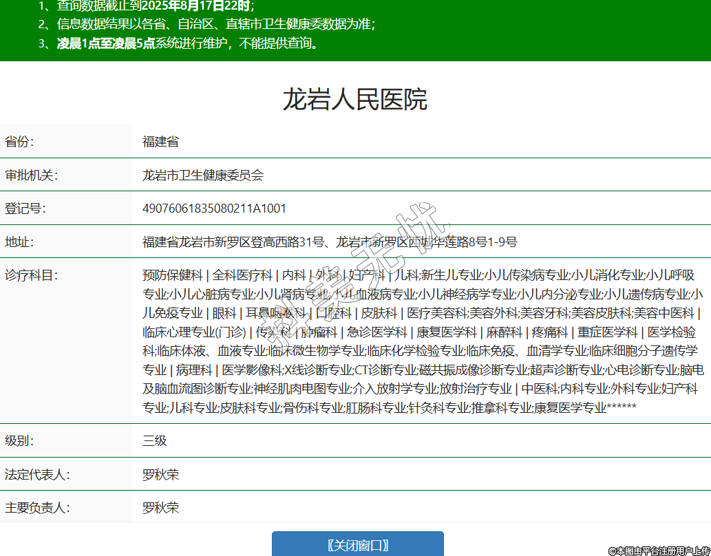 省份:福建省審批機關(guān):龍巖市衛(wèi)生健康委員會登記號:49076061835080211A1001地址:福建省龍巖市新羅區(qū)登高西路31號、龍巖市新羅區(qū)西城華蓮路8號1-9號診療科目:預(yù)防保健科 | 全科醫(yī)療科 | 內(nèi)科 | 外科 | 婦產(chǎn)科 | 兒科;新生兒專業(yè);小兒傳染病專業(yè);小兒消化專業(yè);小兒呼吸專業(yè);小兒心臟病專業(yè);小兒腎病專業(yè);小兒血液病專業(yè);小兒神經(jīng)病學(xué)專業(yè);小兒內(nèi)分泌專業(yè);小兒遺傳病專業(yè);小兒免疫專業(yè) | 眼科 | 耳鼻咽喉科 | 口腔科 | 皮膚科 | 醫(yī)療美容科;美容外科;美容牙科;美容皮膚科;美容中醫(yī)科 | 臨床心理專業(yè)(門診) | 傳染科 | 腫瘤科 | 急診醫(yī)學(xué)科 | 康復(fù)醫(yī)學(xué)科 | 麻醉科 | 疼痛科 | 重癥醫(yī)學(xué)科 | 醫(yī)學(xué)檢驗科;臨床體液、血液專業(yè);臨床微生物學(xué)專業(yè);臨床化學(xué)檢驗專業(yè);臨床免疫、血清學(xué)專業(yè);臨床細胞分子遺傳學(xué)專業(yè) | 病理科 | 醫(yī)學(xué)影像科;X線診斷專業(yè);CT診斷專業(yè);磁共振成像診斷專業(yè);超聲診斷專業(yè);心電診斷專業(yè);腦電及腦血流圖診斷專業(yè);神經(jīng)肌肉電圖專業(yè);介入放射學(xué)專業(yè);放射治療專業(yè) | 中醫(yī)科;內(nèi)科專業(yè);外科專業(yè);婦產(chǎn)科專業(yè);兒科專業(yè);皮膚科專業(yè);骨傷科專業(yè);肛腸科專業(yè);針灸科專業(yè);推拿科專業(yè);康復(fù)醫(yī)學(xué)專業(yè)******級別:三級法定代表人:羅秋榮主要負責人:羅秋榮執(zhí)業(yè)許可證有效期:2025/05/28 -至- 2031/05/27 -