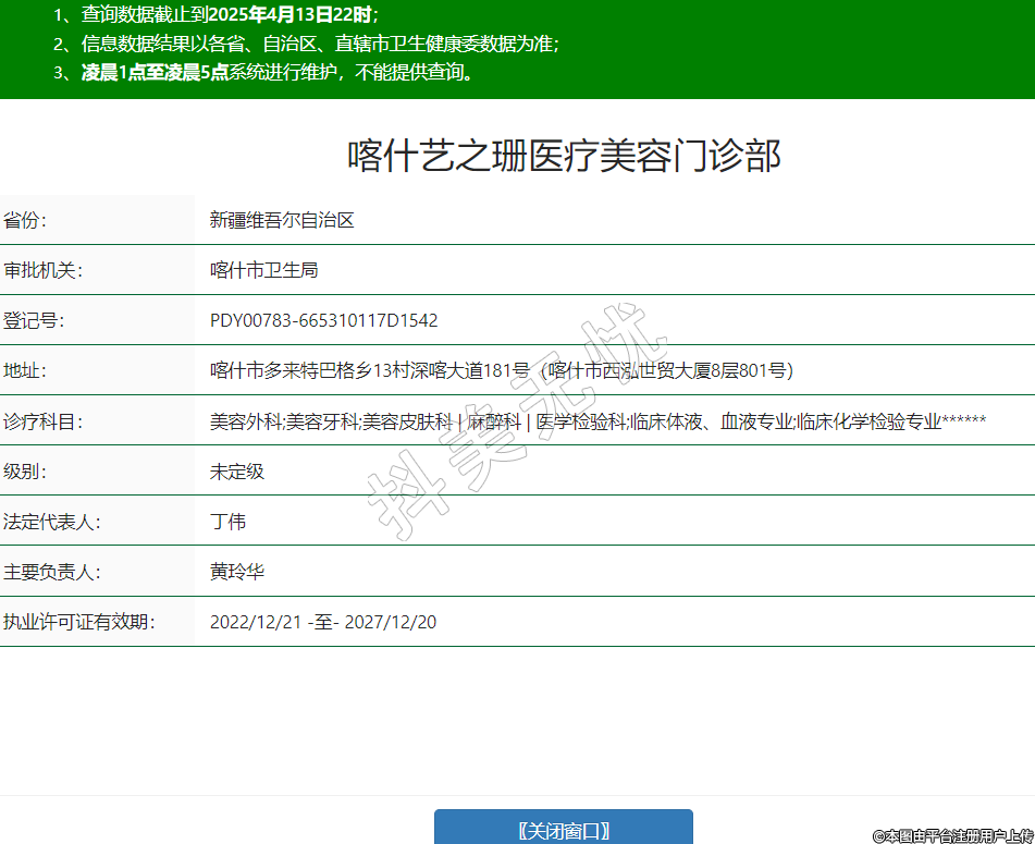 喀什藝之珊醫(yī)療美容門診部,診療科目:美容外科;美容牙科;美容皮膚科 | 麻醉科 | 醫(yī)學(xué)檢驗科;臨床體液、血液專業(yè);臨床化學(xué)檢驗專業(yè)******