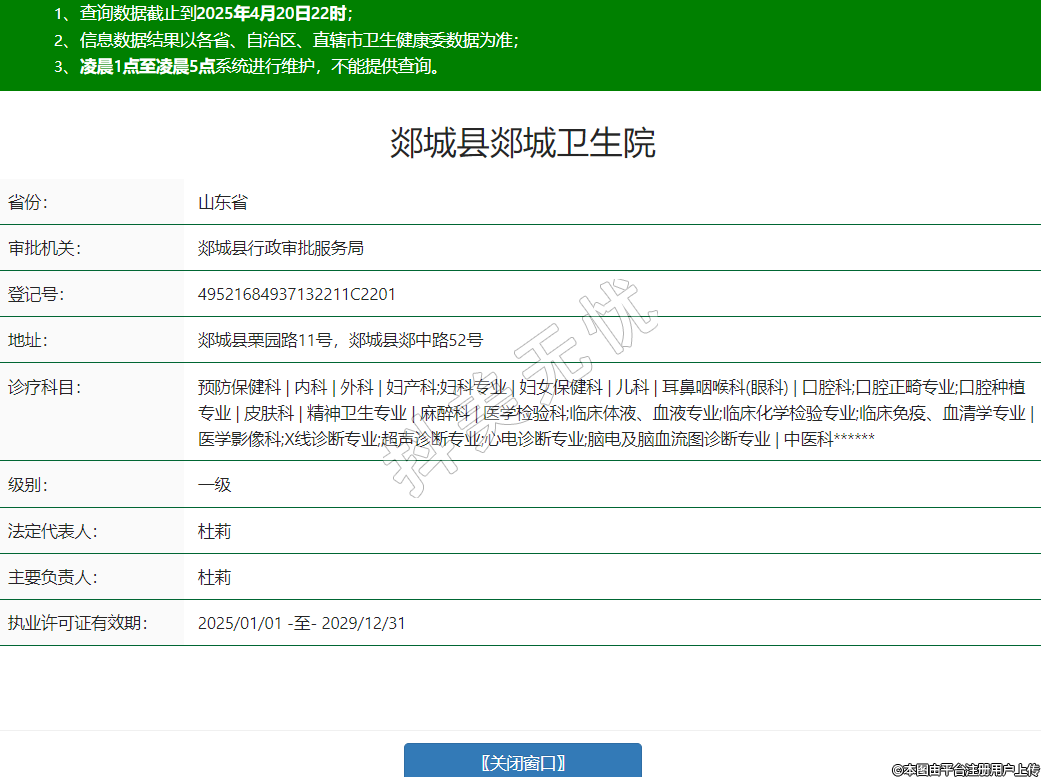 省份:山東省審批機關:郯城縣行政審批服務局登記號:49521684937132211C2201地址:郯城縣栗園路11號,郯城縣郯中路52號診療科目:預防保健科 | 內科 | 外科 | 婦產科;婦科專業(yè) | 婦女保健科 | 兒科 | 耳鼻咽喉科(眼科) | 口腔科;口腔正畸專業(yè);口腔種植專業(yè) | 皮膚科 | 精神衛(wèi)生專業(yè) | 麻醉科 | 醫(yī)學檢驗科;臨床體液、血液專業(yè);臨床化學檢驗專業(yè);臨床免疫、血清學專業(yè) | 醫(yī)學影像科;X線診斷專業(yè);超聲診斷專業(yè);心電診斷專業(yè);腦電及腦血流圖診斷專業(yè) | 中醫(yī)科******級別:一級法定代表人:杜莉主要負責人:杜莉執(zhí)業(yè)許可證有效期:2025/01/01 -至- 2029/12/31 -