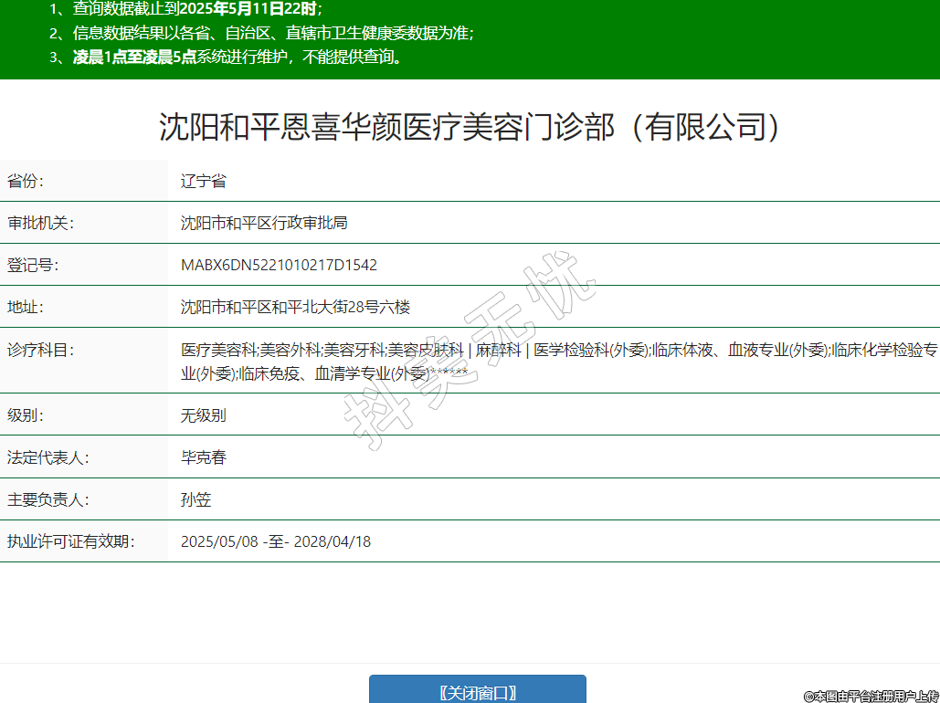 沈陽和平恩喜華顏醫(yī)療美容門診部(有限公司),診療科目:醫(yī)療美容科;美容外科;美容牙科;美容皮膚科 | 麻醉科 | 醫(yī)學(xué)檢驗科(外委);臨床體液、血液專業(yè)(外委);臨床化學(xué)檢驗專業(yè)(外委);臨床免疫、血清學(xué)專業(yè)(外委)******