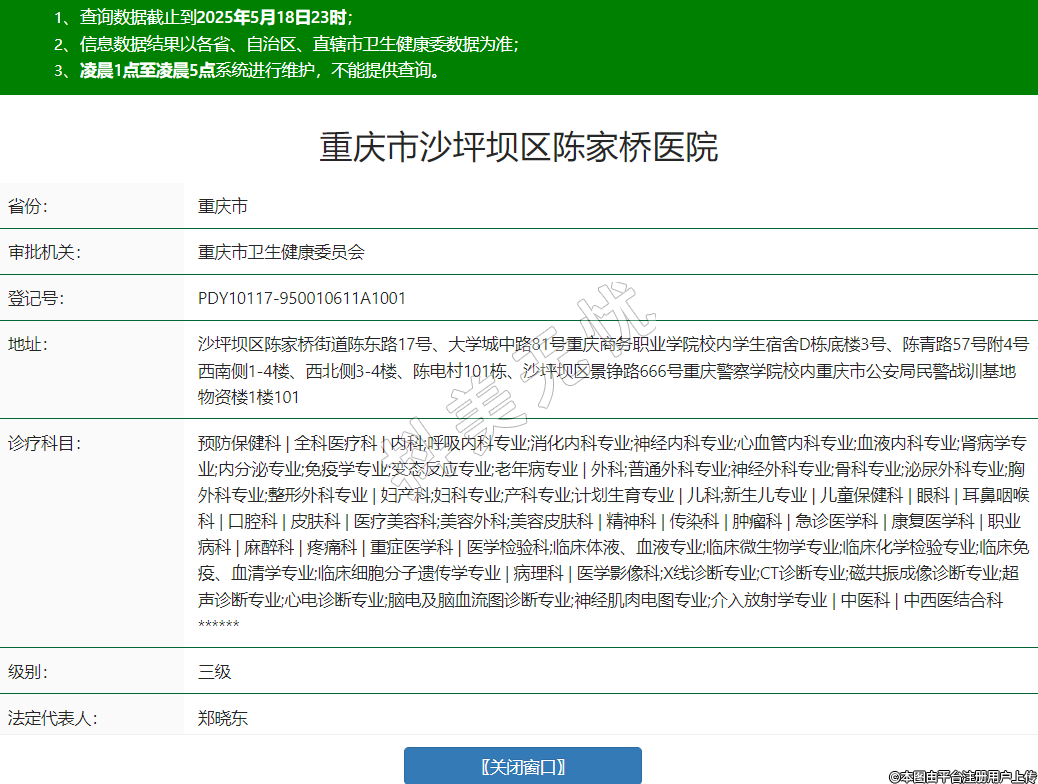 省份:重慶市審批機關:重慶市衛(wèi)生健康委員會登記號:PDY10117-950010611A1001地址:沙坪壩區(qū)陳家橋街道陳東路17號、大學城中路81號重慶商務職業(yè)學院校內學生宿舍D棟底樓3號、陳青路57號附4號西南側1-4樓、西北側3-4樓、陳電村101棟、沙坪壩區(qū)景錚路666號重慶警察學院校內重慶市公安局民警戰(zhàn)訓基地物資樓1樓101診療科目:預防保健科 | 全科醫(yī)療科 | 內科;呼吸內科專業(yè);消化內科專業(yè);神經內科專業(yè);心血管內科專業(yè);血液內科專業(yè);腎病學專業(yè);內分泌專業(yè);免疫學專業(yè);變態(tài)反應專業(yè);老年病專業(yè) | 外科;普通外科專業(yè);神經外科專業(yè);骨科專業(yè);泌尿外科專業(yè);胸外科專業(yè);整形外科專業(yè) | 婦產科;婦科專業(yè);產科專業(yè);計劃生育專業(yè) | 兒科;新生兒專業(yè) | 兒童保健科 | 眼科 | 耳鼻咽喉科 | 口腔科 | 皮膚科 | 醫(yī)療美容科;美容外科;美容皮膚科 | 精神科 | 傳染科 | 腫瘤科 | 急診醫(yī)學科 | 康復醫(yī)學科 | 職業(yè)病科 | 麻醉科 | 疼痛科 | 重癥醫(yī)學科 | 醫(yī)學檢驗科;臨床體液、血液專業(yè);臨床微生物學專業(yè);臨床化學檢驗專業(yè);臨床免疫、血清學專業(yè);臨床細胞分子遺傳學專業(yè) | 病理科 | 醫(yī)學影像科;X線診斷專業(yè);CT診斷專業(yè);磁共振成像診斷專業(yè);超聲診斷專業(yè);心電診斷專業(yè);腦電及腦血流圖診斷專業(yè);神經肌肉電圖專業(yè);介入放射學專業(yè) | 中醫(yī)科 | 中西醫(yī)結合科******級別:三級法定代表人:鄭曉東主要負責人:鄭曉東執(zhí)業(yè)許可證有效期:2024/12/05 -至- 2036/04/29 -