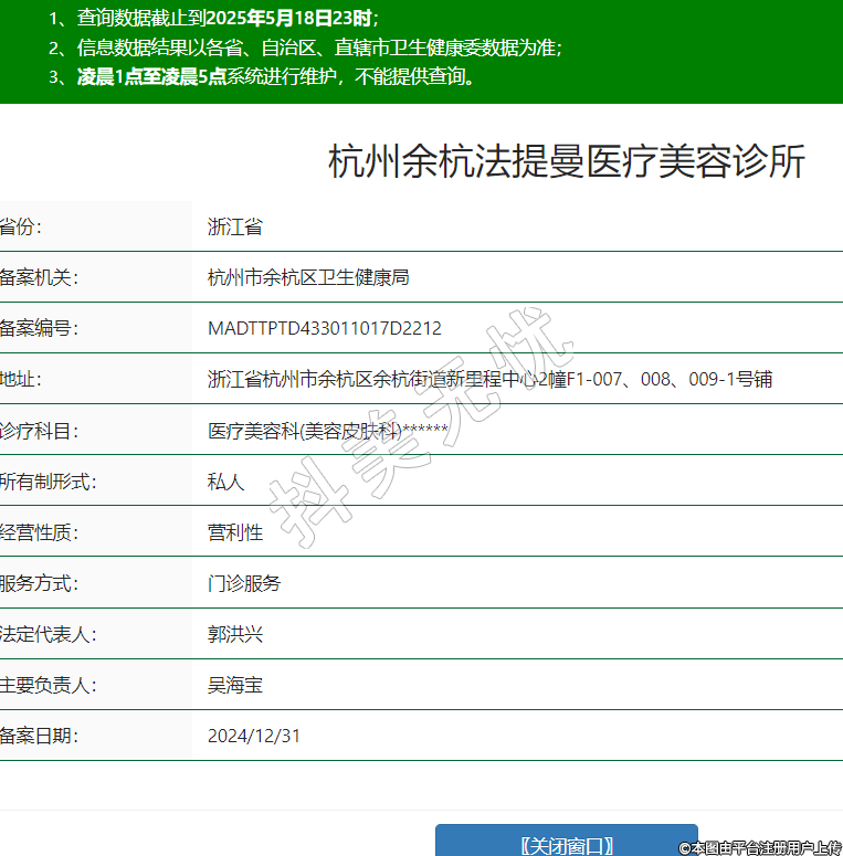 省份:浙江省備案機(jī)關(guān):杭州市余杭區(qū)衛(wèi)生健康局備案編號(hào):MADTTPTD433011017D2212地址:浙江省杭州市余杭區(qū)余杭街道新里程中心2幢F1-007、008、009-1號(hào)鋪診療科目:醫(yī)療美容科(美容皮膚科)******所有制形式:私人經(jīng)營(yíng)性質(zhì):營(yíng)利性服務(wù)方式:門診服務(wù)法定代表人:郭洪興主要負(fù)責(zé)人:吳海寶備案日期:2024/12/31 -