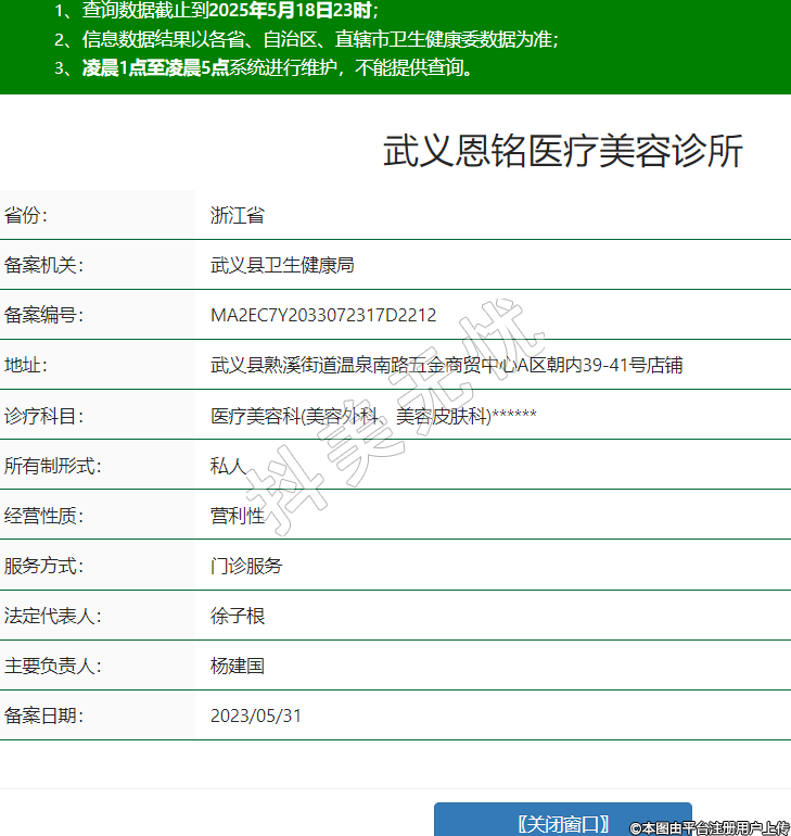 省份:浙江省備案機(jī)關(guān):武義縣衛(wèi)生健康局備案編號(hào):MA2EC7Y2033072317D2212地址:武義縣熟溪街道溫泉南路五金商貿(mào)中心A區(qū)朝內(nèi)39-41號(hào)店鋪診療科目:醫(yī)療美容科(美容外科、美容皮膚科)******所有制形式:私人經(jīng)營(yíng)性質(zhì):營(yíng)利性服務(wù)方式:門診服務(wù)法定代表人:徐子根主要負(fù)責(zé)人:楊建國(guó)備案日期:2023/05/31 -