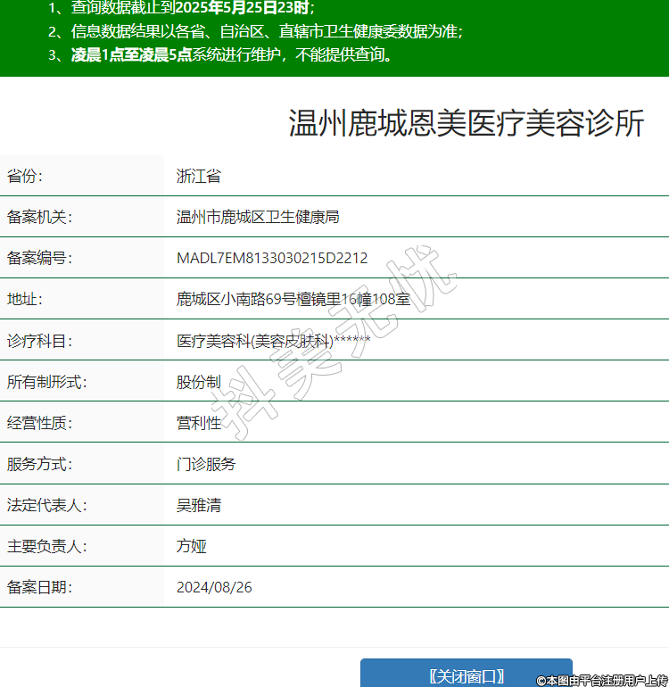 省份:浙江省備案機關:溫州市鹿城區(qū)衛(wèi)生健康局備案編號:MADL7EM8133030215D2212地址:鹿城區(qū)小南路69號檀鏡里16幢108室診療科目:醫(yī)療美容科(美容皮膚科)******所有制形式:股份制經營性質:營利性服務方式:門診服務法定代表人:吳雅清主要負責人:方婭備案日期:2024/08/26 -