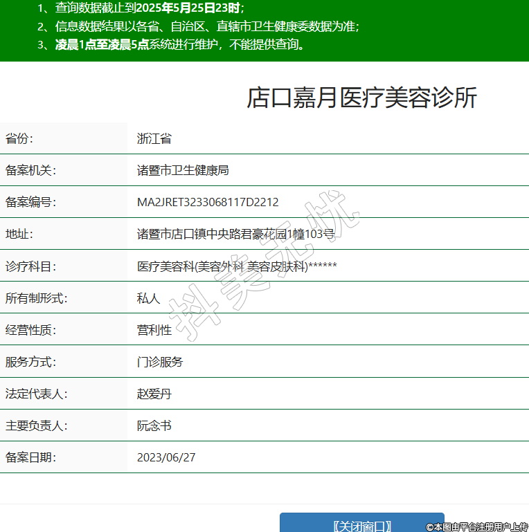 省份:浙江省備案機(jī)關(guān):諸暨市衛(wèi)生健康局備案編號(hào):MA2JRET3233068117D2212地址:諸暨市店口鎮(zhèn)中央路君豪花園1幢103號(hào)診療科目:醫(yī)療美容科(美容外科 美容皮膚科)******所有制形式:私人經(jīng)營(yíng)性質(zhì):營(yíng)利性服務(wù)方式:門診服務(wù)法定代表人:趙愛丹主要負(fù)責(zé)人:阮念書備案日期:2023/06/27 -