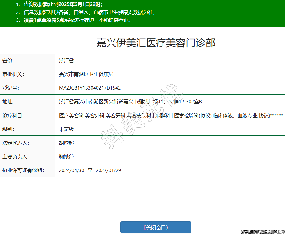 省份:浙江省審批機關:嘉興市南湖區(qū)衛(wèi)生健康局登記號:MA2JG81Y133040217D1542地址:浙江省嘉興市南湖區(qū)新興街道嘉興市耀城廣場11、12幢12-302室B診療科目:醫(yī)療美容科;美容外科;美容牙科;美容皮膚科 | 麻醉科 | 醫(yī)學檢驗科(協(xié)議);臨床體液、血液專業(yè)(協(xié)議)******級別:未定級法定代表人:胡厚超主要負責人:鞠娥萍執(zhí)業(yè)許可證有效期:2024/04/30 -至- 2027/01/29 -