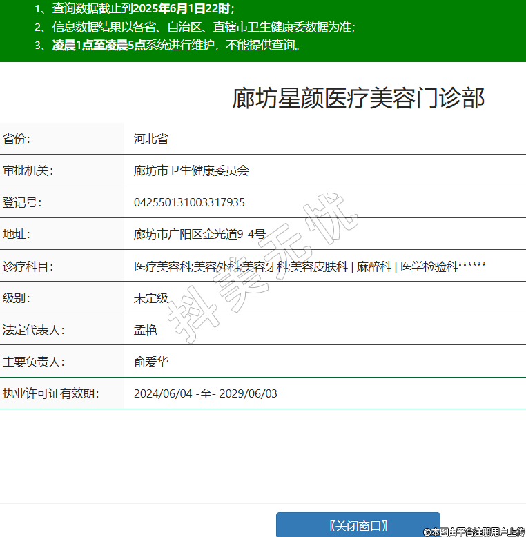 省份:河北省審批機關:廊坊市衛(wèi)生健康委員會登記號:042550131003317935地址:廊坊市廣陽區(qū)金光道9-4號診療科目:醫(yī)療美容科;美容外科;美容牙科;美容皮膚科 | 麻醉科 | 醫(yī)學檢驗科******級別:未定級法定代表人:孟艷主要負責人:俞愛華執(zhí)業(yè)許可證有效期:2024/06/04 -至- 2029/06/03 -