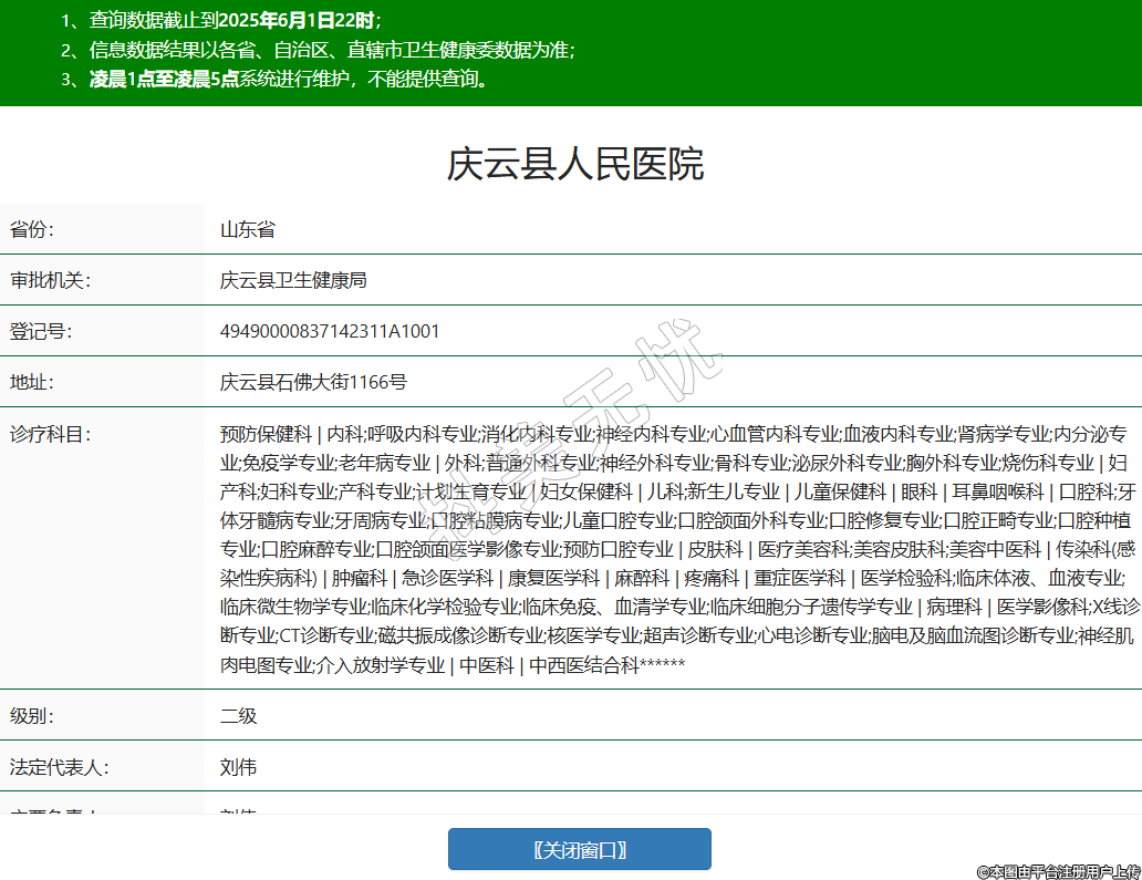 省份:山東省審批機關(guān):慶云縣衛(wèi)生健康局登記號:49490000837142311A1001地址:慶云縣石佛大街1166號診療科目:預(yù)防保健科 | 內(nèi)科;呼吸內(nèi)科專業(yè);消化內(nèi)科專業(yè);神經(jīng)內(nèi)科專業(yè);心血管內(nèi)科專業(yè);血液內(nèi)科專業(yè);腎病學專業(yè);內(nèi)分泌專業(yè);免疫學專業(yè);老年病專業(yè) | 外科;普通外科專業(yè);神經(jīng)外科專業(yè);骨科專業(yè);泌尿外科專業(yè);胸外科專業(yè);燒傷科專業(yè) | 婦產(chǎn)科;婦科專業(yè);產(chǎn)科專業(yè);計劃生育專業(yè) | 婦女保健科 | 兒科;新生兒專業(yè) | 兒童保健科 | 眼科 | 耳鼻咽喉科 | 口腔科;牙體牙髓病專業(yè);牙周病專業(yè);口腔粘膜病專業(yè);兒童口腔專業(yè);口腔頜面外科專業(yè);口腔修復專業(yè);口腔正畸專業(yè);口腔種植專業(yè);口腔麻醉專業(yè);口腔頜面醫(yī)學影像專業(yè);預(yù)防口腔專業(yè) | 皮膚科 | 醫(yī)療美容科;美容皮膚科;美容中醫(yī)科 | 傳染科(感染性疾病科) | 腫瘤科 | 急診醫(yī)學科 | 康復醫(yī)學科 | 麻醉科 | 疼痛科 | 重癥醫(yī)學科 | 醫(yī)學檢驗科;臨床體液、血液專業(yè);臨床微生物學專業(yè);臨床化學檢驗專業(yè);臨床免疫、血清學專業(yè);臨床細胞分子遺傳學專業(yè) | 病理科 | 醫(yī)學影像科;X線診斷專業(yè);CT診斷專業(yè);磁共振成像診斷專業(yè);核醫(yī)學專業(yè);超聲診斷專業(yè);心電診斷專業(yè);腦電及腦血流圖診斷專業(yè);神經(jīng)肌肉電圖專業(yè);介入放射學專業(yè) | 中醫(yī)科 | 中西醫(yī)結(jié)合科******級別:二級法定代表人:劉偉主要負責人:劉偉執(zhí)業(yè)許可證有效期:2022/01/26 -至- 2037/01/25 -