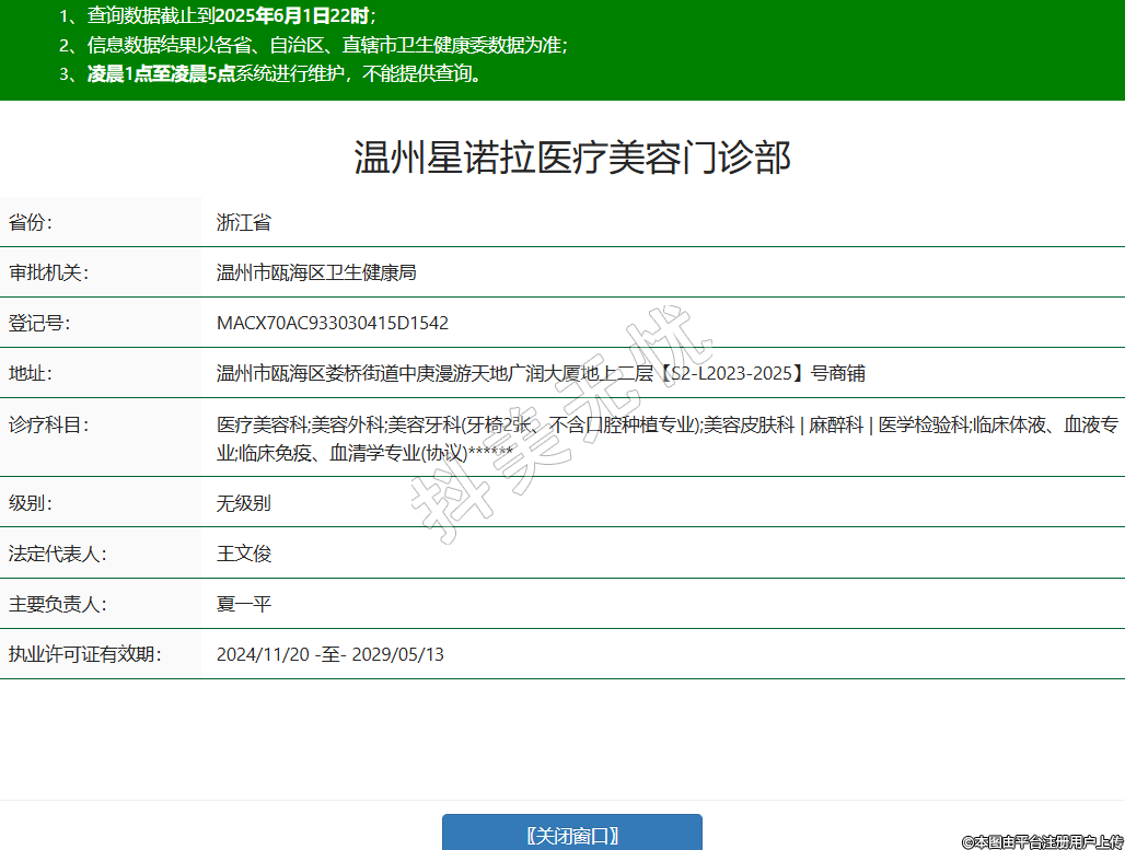 省份:浙江省審批機(jī)關(guān):溫州市甌海區(qū)衛(wèi)生健康局登記號(hào):MACX70AC933030415D1542地址:溫州市甌海區(qū)婁橋街道中庚漫游天地廣潤(rùn)大廈地上二層【S2-L2023-2025】號(hào)商鋪診療科目:醫(yī)療美容科;美容外科;美容牙科(牙椅2張、不含口腔種植專業(yè));美容皮膚科 | 麻醉科 | 醫(yī)學(xué)檢驗(yàn)科;臨床體液、血液專業(yè);臨床免疫、血清學(xué)專業(yè)(協(xié)議)******級(jí)別:無(wú)級(jí)別法定代表人:王文俊主要負(fù)責(zé)人:夏一平執(zhí)業(yè)許可證有效期:2024/11/20 -至- 2029/05/13 -