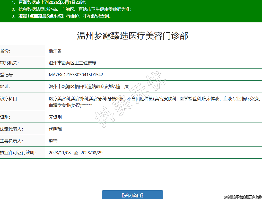 省份:浙江省審批機關(guān):溫州市甌海區(qū)衛(wèi)生健康局登記號:MA7EXD21533030415D1542地址:溫州市甌海區(qū)梧田街道站前商貿(mào)城A幢二層診療科目:醫(yī)療美容科;美容外科;美容牙科(牙椅2張、不含口腔種植);美容皮膚科 | 醫(yī)學(xué)檢驗科;臨床體液、血液專業(yè);臨床免疫、血清學(xué)專業(yè)(協(xié)議)******級別:無級別法定代表人:代明瑤主要負責(zé)人:趙琦執(zhí)業(yè)許可證有效期:2023/11/08 -至- 2028/08/29 -