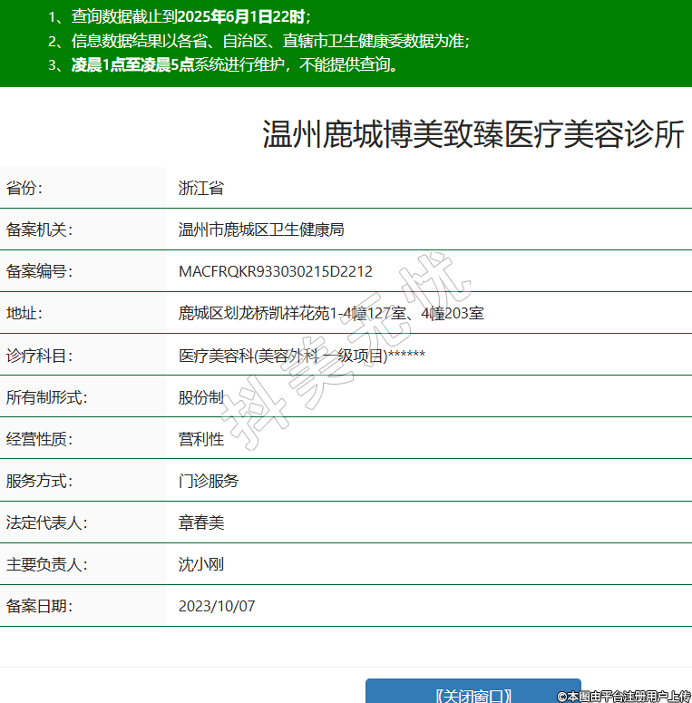 省份:浙江省備案機(jī)關(guān):溫州市鹿城區(qū)衛(wèi)生健康局備案編號(hào):MACFRQKR933030215D2212地址:鹿城區(qū)劃龍橋凱祥花苑1-4幢127室、4幢203室診療科目:醫(yī)療美容科(美容外科 一級(jí)項(xiàng)目)******所有制形式:股份制經(jīng)營(yíng)性質(zhì):營(yíng)利性服務(wù)方式:門(mén)診服務(wù)法定代表人:章春美主要負(fù)責(zé)人:沈小剛備案日期:2023/10/07 -