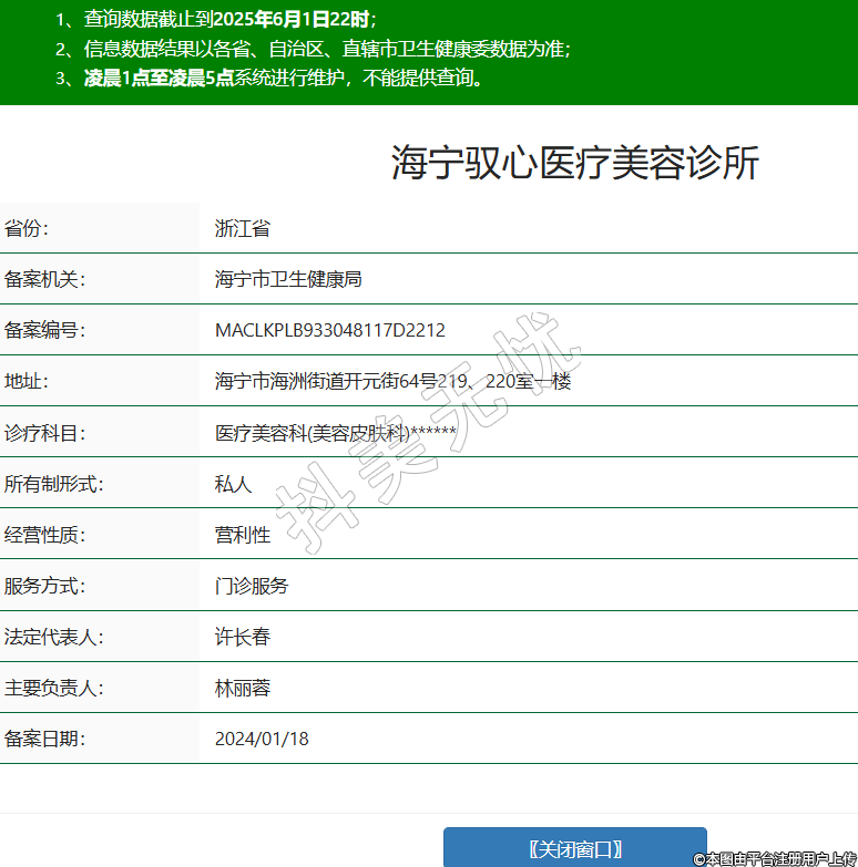 省份:浙江省備案機關:海寧市衛(wèi)生健康局備案編號:MACLKPLB933048117D2212地址:海寧市海洲街道開元街64號219、220室一樓診療科目:醫(yī)療美容科(美容皮膚科)******所有制形式:私人經(jīng)營性質(zhì):營利性服務方式:門診服務法定代表人:許長春主要負責人:林麗蓉備案日期:2024/01/18 -