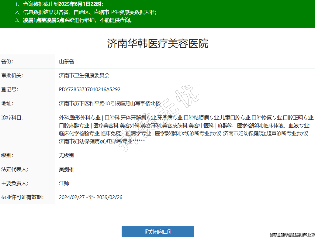 省份:山東省審批機(jī)關(guān):濟(jì)南市衛(wèi)生健康委員會登記號:PDY72853737010216A5292地址:濟(jì)南市歷下區(qū)和平路18號銀座燕山寫字樓北樓診療科目:外科;整形外科專業(yè) | 口腔科;牙體牙髓病專業(yè);牙周病專業(yè);口腔粘膜病專業(yè);兒童口腔專業(yè);口腔修復(fù)專業(yè);口腔正畸專業(yè);口腔麻醉專業(yè) | 醫(yī)療美容科;美容外科;美容牙科;美容皮膚科;美容中醫(yī)科 | 麻醉科 | 醫(yī)學(xué)檢驗(yàn)科;臨床體液、血液專業(yè);臨床化學(xué)檢驗(yàn)專業(yè);臨床免疫、血清學(xué)專業(yè) | 醫(yī)學(xué)影像科;X線診斷專業(yè)(協(xié)議-濟(jì)南市婦幼保健院);超聲診斷專業(yè)(協(xié)議-濟(jì)南市婦幼保健院);心電診斷專業(yè)******級別:無級別法定代表人:吳劍雄主要負(fù)責(zé)人:汪帥執(zhí)業(yè)許可證有效期:2024/02/27 -至- 2039/02/26 -