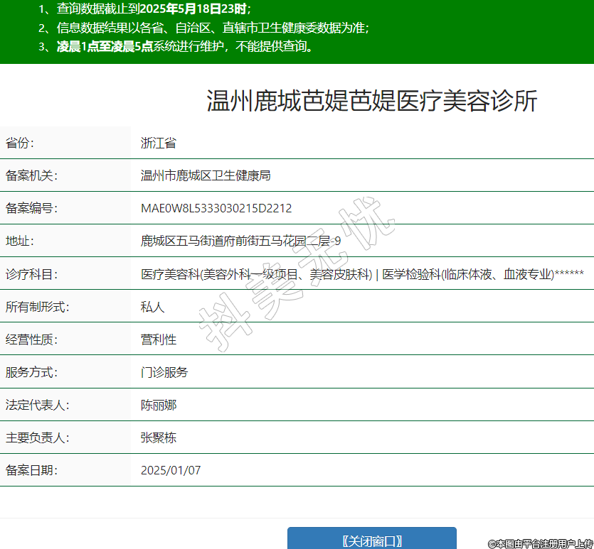 省份:浙江省備案機關(guān):溫州市鹿城區(qū)衛(wèi)生健康局備案編號:MAE0W8L5333030215D2212地址:鹿城區(qū)五馬街道府前街五馬花園二層-9診療科目:醫(yī)療美容科(美容外科一級項目、美容皮膚科) | 醫(yī)學(xué)檢驗科(臨床體液、血液專業(yè))******所有制形式:私人經(jīng)營性質(zhì):營利性服務(wù)方式:門診服務(wù)法定代表人:陳麗娜主要負(fù)責(zé)人:張聚棟備案日期:2025/01/07 -