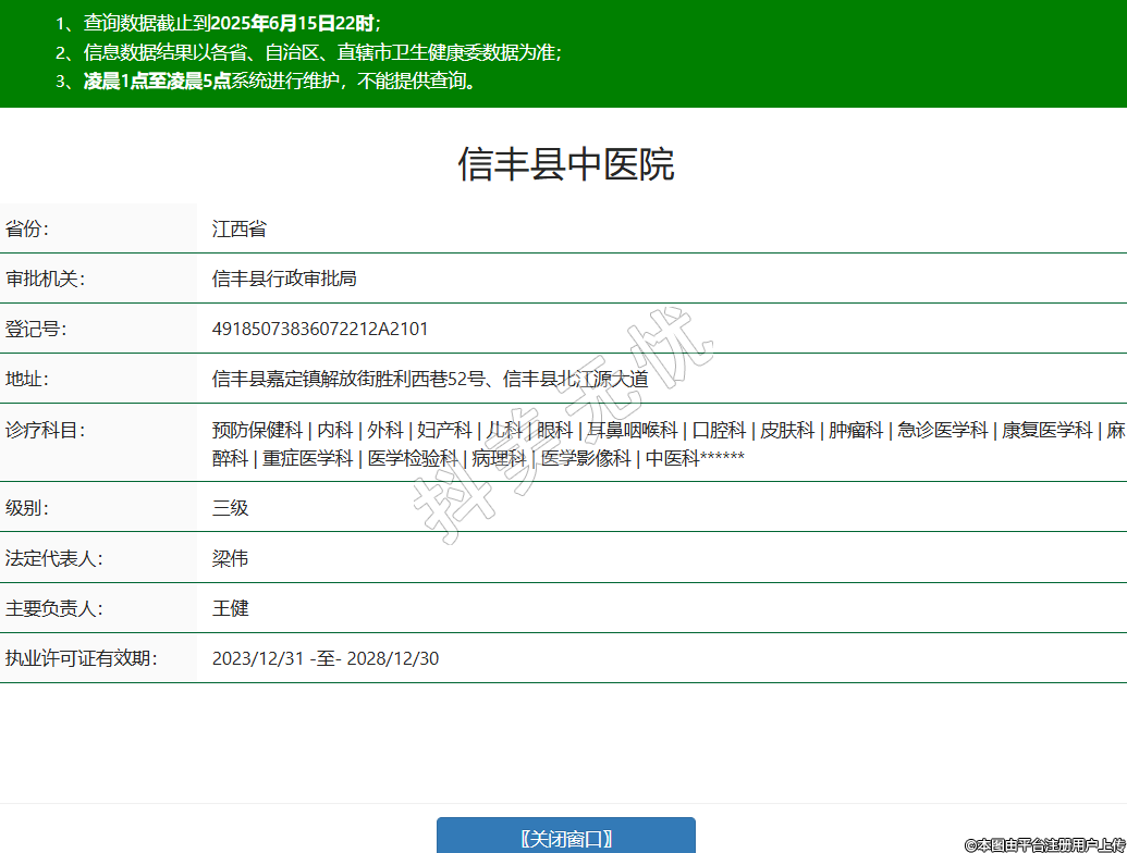 省份:江西省審批機關(guān):信豐縣行政審批局登記號:49185073836072212A2101地址:信豐縣嘉定鎮(zhèn)解放街勝利西巷52號、信豐縣北江源大道診療科目:預防保健科 | 內(nèi)科 | 外科 | 婦產(chǎn)科 | 兒科 | 眼科 | 耳鼻咽喉科 | 口腔科 | 皮膚科 | 腫瘤科 | 急診醫(yī)學科 | 康復醫(yī)學科 | 麻醉科 | 重癥醫(yī)學科 | 醫(yī)學檢驗科 | 病理科 | 醫(yī)學影像科 | 中醫(yī)科******級別:三級法定代表人:梁偉主要負責人:王健執(zhí)業(yè)許可證有效期:2023/12/31 -至- 2028/12/30 -