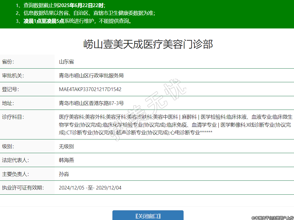 省份:山東省審批機關(guān):青島市嶗山區(qū)行政審批服務(wù)局登記號:MAE4TAKP337021217D1542地址:青島市嶗山區(qū)香港東路87-3號診療科目:醫(yī)療美容科;美容外科;美容牙科;美容皮膚科;美容中醫(yī)科 | 麻醉科 | 醫(yī)學(xué)檢驗科;臨床體液、血液專業(yè);臨床微生物學(xué)專業(yè)(協(xié)議完成);臨床化學(xué)檢驗專業(yè)(協(xié)議完成);臨床免疫、血清學(xué)專業(yè) | 醫(yī)學(xué)影像科;X線診斷專業(yè)(協(xié)議完成);CT診斷專業(yè)(協(xié)議完成);超聲診斷專業(yè)(協(xié)議完成);心電診斷專業(yè)******級別:無級別法定代表人:韓海燕主要負責人:孫淼執(zhí)業(yè)許可證有效期:2024/12/05 -至- 2029/12/04 -