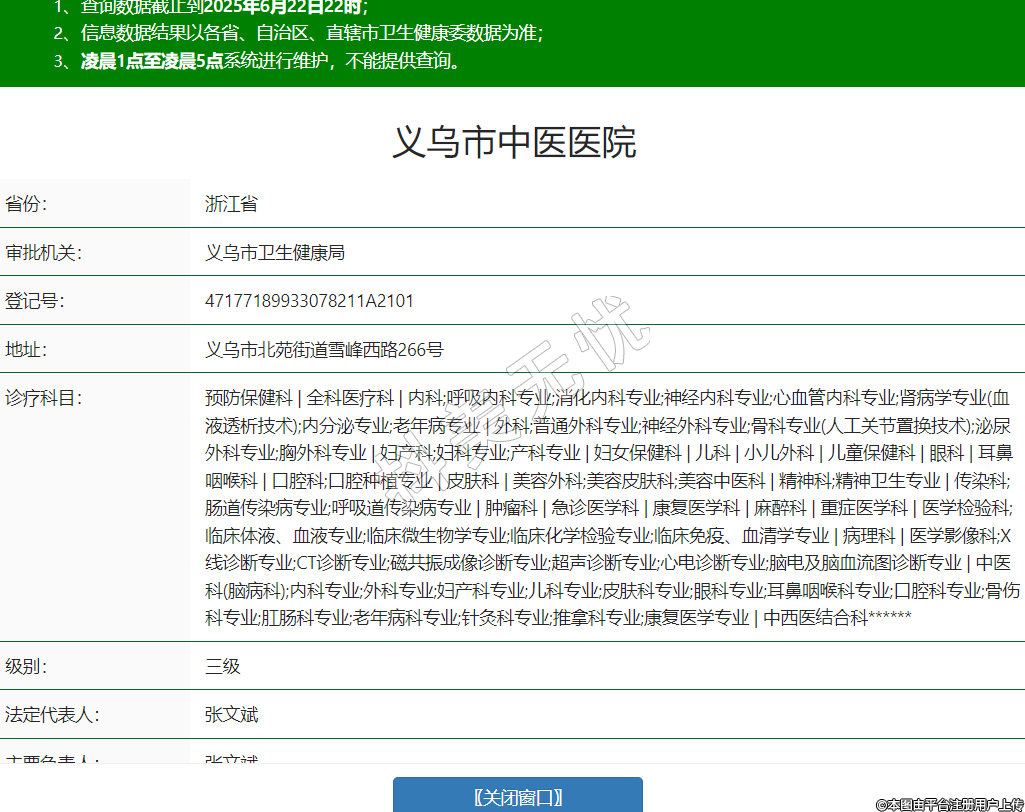省份:浙江省審批機關(guān):義烏市衛(wèi)生健康局登記號:47177189933078211A2101地址:義烏市北苑街道雪峰西路266號診療科目:預(yù)防保健科 | 全科醫(yī)療科 | 內(nèi)科;呼吸內(nèi)科專業(yè);消化內(nèi)科專業(yè);神經(jīng)內(nèi)科專業(yè);心血管內(nèi)科專業(yè);腎病學專業(yè)(血液透析技術(shù));內(nèi)分泌專業(yè);老年病專業(yè) | 外科;普通外科專業(yè);神經(jīng)外科專業(yè);骨科專業(yè)(人工關(guān)節(jié)置換技術(shù));泌尿外科專業(yè);胸外科專業(yè) | 婦產(chǎn)科;婦科專業(yè);產(chǎn)科專業(yè) | 婦女保健科 | 兒科 | 小兒外科 | 兒童保健科 | 眼科 | 耳鼻咽喉科 | 口腔科;口腔種植專業(yè) | 皮膚科 | 美容外科;美容皮膚科;美容中醫(yī)科 | 精神科;精神衛(wèi)生專業(yè) | 傳染科;腸道傳染病專業(yè);呼吸道傳染病專業(yè) | 腫瘤科 | 急診醫(yī)學科 | 康復(fù)醫(yī)學科 | 麻醉科 | 重癥醫(yī)學科 | 醫(yī)學檢驗科;臨床體液、血液專業(yè);臨床微生物學專業(yè);臨床化學檢驗專業(yè);臨床免疫、血清學專業(yè) | 病理科 | 醫(yī)學影像科;X線診斷專業(yè);CT診斷專業(yè);磁共振成像診斷專業(yè);超聲診斷專業(yè);心電診斷專業(yè);腦電及腦血流圖診斷專業(yè) | 中醫(yī)科(腦病科);內(nèi)科專業(yè);外科專業(yè);婦產(chǎn)科專業(yè);兒科專業(yè);皮膚科專業(yè);眼科專業(yè);耳鼻咽喉科專業(yè);口腔科專業(yè);骨傷科專業(yè);肛腸科專業(yè);老年病科專業(yè);針灸科專業(yè);推拿科專業(yè);康復(fù)醫(yī)學專業(yè) | 中西醫(yī)結(jié)合科******級別:三級法定代表人:張文斌主要負責人:張文斌執(zhí)業(yè)許可證有效期:2025/06/10 -至- 2030/04/01 -
