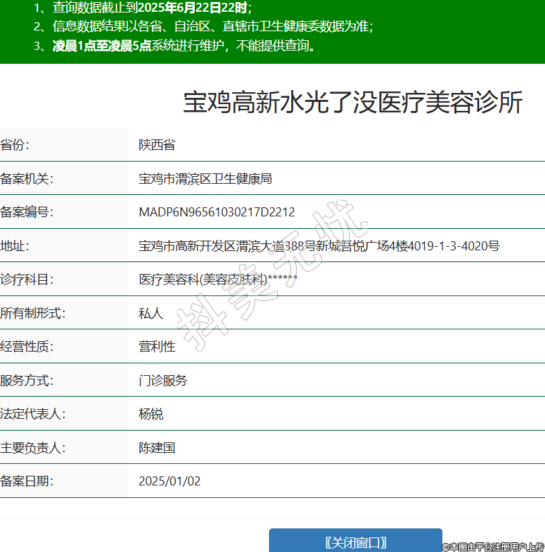省份:陜西省備案機(jī)關(guān):寶雞市渭濱區(qū)衛(wèi)生健康局備案編號(hào):MADP6N96561030217D2212地址:寶雞市高新開發(fā)區(qū)渭濱大道388號(hào)新城吾悅廣場(chǎng)4樓4019-1-3-4020號(hào)診療科目:醫(yī)療美容科(美容皮膚科)******所有制形式:私人經(jīng)營(yíng)性質(zhì):營(yíng)利性服務(wù)方式:門診服務(wù)法定代表人:楊銳主要負(fù)責(zé)人:陳建國(guó)備案日期:2025/01/02 -