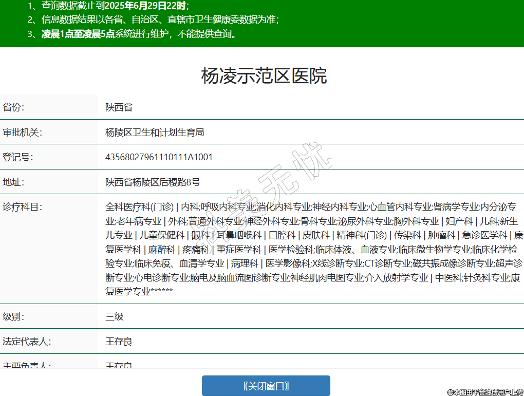 省份:陜西省審批機(jī)關(guān):楊陵區(qū)衛(wèi)生和計劃生育局登記號:43568027961110111A1001地址:陜西省楊陵區(qū)后稷路8號診療科目:全科醫(yī)療科(門診) | 內(nèi)科;呼吸內(nèi)科專業(yè);消化內(nèi)科專業(yè);神經(jīng)內(nèi)科專業(yè);心血管內(nèi)科專業(yè);腎病學(xué)專業(yè);內(nèi)分泌專業(yè);老年病專業(yè) | 外科;普通外科專業(yè);神經(jīng)外科專業(yè);骨科專業(yè);泌尿外科專業(yè);胸外科專業(yè) | 婦產(chǎn)科 | 兒科;新生兒專業(yè) | 兒童保健科 | 眼科 | 耳鼻咽喉科 | 口腔科 | 皮膚科 | 精神科(門診) | 傳染科 | 腫瘤科 | 急診醫(yī)學(xué)科 | 康復(fù)醫(yī)學(xué)科 | 麻醉科 | 疼痛科 | 重癥醫(yī)學(xué)科 | 醫(yī)學(xué)檢驗科;臨床體液、血液專業(yè);臨床微生物學(xué)專業(yè);臨床化學(xué)檢驗專業(yè);臨床免疫、血清學(xué)專業(yè) | 病理科 | 醫(yī)學(xué)影像科;X線診斷專業(yè);CT診斷專業(yè);磁共振成像診斷專業(yè);超聲診斷專業(yè);心電診斷專業(yè);腦電及腦血流圖診斷專業(yè);神經(jīng)肌肉電圖專業(yè);介入放射學(xué)專業(yè) | 中醫(yī)科;針灸科專業(yè);康復(fù)醫(yī)學(xué)專業(yè)******級別:三級法定代表人:王存良主要負(fù)責(zé)人:王存良執(zhí)業(yè)許可證有效期:2022/10/14 -至- 2027/10/15 -