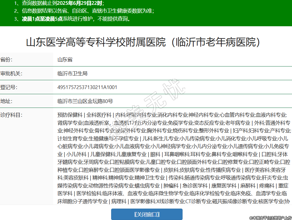 省份:山東省審批機(jī)關(guān):臨沂市衛(wèi)生局登記號:49517572537130211A1001地址:臨沂市蘭山區(qū)金壇路80號診療科目:預(yù)防保健科 | 全科醫(yī)療科 | 內(nèi)科;呼吸內(nèi)科專業(yè);消化內(nèi)科專業(yè);神經(jīng)內(nèi)科專業(yè);心血管內(nèi)科專業(yè);血液內(nèi)科專業(yè);腎病學(xué)專業(yè)(血液透析室,血透機(jī)17臺);內(nèi)分泌專業(yè);免疫學(xué)專業(yè);變態(tài)反應(yīng)專業(yè);老年病專業(yè) | 外科;普通外科專業(yè);神經(jīng)外科專業(yè);骨科專業(yè);泌尿外科專業(yè);胸外科專業(yè);燒傷科專業(yè);整形外科專業(yè) | 婦產(chǎn)科;婦科專業(yè);產(chǎn)科專業(yè);計劃生育專業(yè);生殖健康與不孕癥專業(yè) | 兒科;新生兒專業(yè);小兒傳染病專業(yè);小兒消化專業(yè);小兒呼吸專業(yè);小兒心臟病專業(yè);小兒腎病專業(yè);小兒血液病專業(yè);小兒神經(jīng)病學(xué)專業(yè);小兒內(nèi)分泌專業(yè);小兒遺傳病專業(yè);小兒免疫專業(yè) | 小兒外科 | 兒童保健科;兒童康復(fù)專業(yè) | 眼科 | 耳鼻咽喉科;耳科專業(yè);鼻科專業(yè);咽喉科專業(yè) | 口腔科;牙體牙髓病專業(yè);牙周病專業(yè);口腔粘膜病專業(yè);兒童口腔專業(yè);口腔頜面外科專業(yè);口腔修復(fù)專業(yè);口腔正畸專業(yè);口腔種植專業(yè);口腔麻醉專業(yè);口腔頜面醫(yī)學(xué)影像專業(yè) | 皮膚科;皮膚病專業(yè);性傳播疾病專業(yè) | 醫(yī)療美容科;美容牙科;美容皮膚科 | 精神科;精神病專業(yè);精神衛(wèi)生專業(yè) | 傳染科;腸道傳染病專業(yè);呼吸道傳染病專業(yè);肝炎專業(yè);蟲媒傳染病專業(yè);動物源性傳染病專業(yè);蠕蟲病專業(yè) | 腫瘤科 | 急診醫(yī)學(xué)科 | 康復(fù)醫(yī)學(xué)科 | 麻醉科 | 疼痛科 | 重癥醫(yī)學(xué)科 | 醫(yī)學(xué)檢驗科;臨床體液、血液專業(yè);臨床微生物學(xué)專業(yè);臨床化學(xué)檢驗專業(yè);臨床免疫、血清學(xué)專業(yè);臨床細(xì)胞分子遺傳學(xué)專業(yè) | 病理科 | 醫(yī)學(xué)影像科;X線診斷專業(yè);CT診斷專業(yè);磁共振成像診斷專業(yè);核醫(yī)學(xué)專業(yè)(協(xié)議);超聲診斷專業(yè);心電診斷專業(yè);腦電及腦血流圖診斷專業(yè);神經(jīng)肌肉電圖專業(yè);介入放射學(xué)專業(yè) | 中醫(yī)科******級別:二級法定代表人:鄭佩芹主要負(fù)責(zé)人:鄭佩芹執(zhí)業(yè)許可證有效期:2025/06/17 -至- 2036/05/10 -