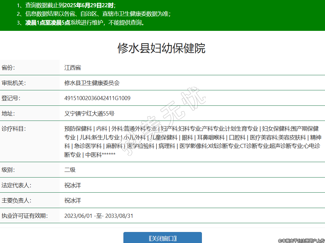 省份:江西省審批機(jī)關(guān):修水縣衛(wèi)生健康委員會登記號:49151002036042411G1009地址:義寧鎮(zhèn)寧紅大道55號診療科目:預(yù)防保健科 | 內(nèi)科 | 外科;普通外科專業(yè) | 婦產(chǎn)科;婦科專業(yè);產(chǎn)科專業(yè);計(jì)劃生育專業(yè) | 婦女保健科;圍產(chǎn)期保健專業(yè) | 兒科;新生兒專業(yè) | 小兒外科 | 兒童保健科 | 眼科 | 耳鼻咽喉科 | 口腔科 | 醫(yī)療美容科;美容皮膚科 | 精神科 | 急診醫(yī)學(xué)科 | 麻醉科 | 醫(yī)學(xué)檢驗(yàn)科 | 病理科 | 醫(yī)學(xué)影像科;X線診斷專業(yè);CT診斷專業(yè);超聲診斷專業(yè);心電診斷專業(yè) | 中醫(yī)科******級別:二級法定代表人:祝冰洋主要負(fù)責(zé)人:祝冰洋執(zhí)業(yè)許可證有效期:2023/06/01 -至- 2033/08/31 -