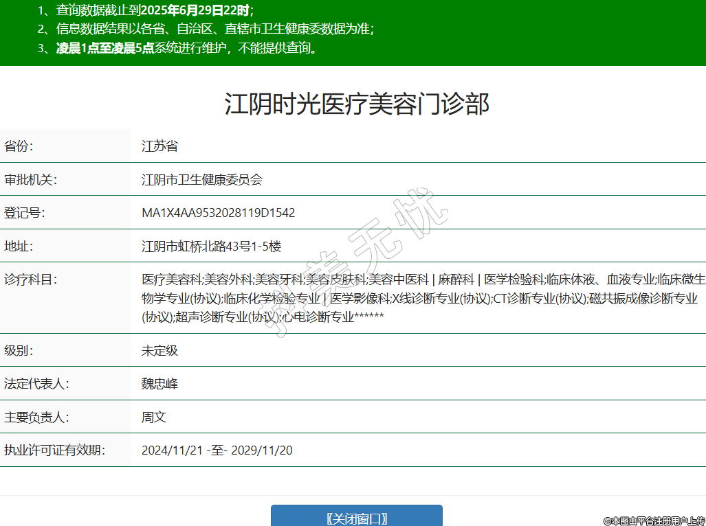 江陰時光醫(yī)療美容門診部,診療科目:醫(yī)療美容科;美容外科;美容牙科;美容皮膚科;美容中醫(yī)科 | 麻醉科 | 醫(yī)學檢驗科;臨床體液、血液專業(yè);臨床微生物學專業(yè)(協(xié)議);臨床化學檢驗專業(yè) | 醫(yī)學影像科;X線診斷專業(yè)(協(xié)議);CT診斷專業(yè)(協(xié)議);磁共振成像診斷專業(yè)(協(xié)議);超聲診斷專業(yè)(協(xié)議);心電診斷專業(yè)******