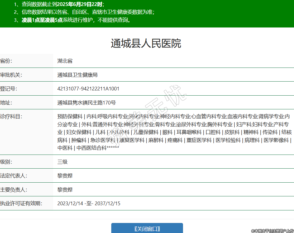 省份:湖北省審批機(jī)關(guān):通城縣衛(wèi)生健康局登記號(hào):42131077-942122211A1001地址:通城縣雋水鎮(zhèn)民主路170號(hào)診療科目:預(yù)防保健科 | 內(nèi)科;呼吸內(nèi)科專業(yè);消化內(nèi)科專業(yè);神經(jīng)內(nèi)科專業(yè);心血管內(nèi)科專業(yè);血液內(nèi)科專業(yè);腎病學(xué)專業(yè);內(nèi)分泌專業(yè) | 外科;普通外科專業(yè);神經(jīng)外科專業(yè);骨科專業(yè);泌尿外科專業(yè);胸外科專業(yè) | 婦產(chǎn)科;婦科專業(yè);產(chǎn)科專業(yè) | 婦女保健科 | 兒科 | 小兒外科 | 兒童保健科 | 眼科 | 耳鼻咽喉科 | 口腔科 | 皮膚科 | 精神科 | 傳染科 | 結(jié)核病科 | 腫瘤科 | 急診醫(yī)學(xué)科 | 康復(fù)醫(yī)學(xué)科 | 麻醉科 | 疼痛科 | 重癥醫(yī)學(xué)科 | 醫(yī)學(xué)檢驗(yàn)科 | 病理科 | 醫(yī)學(xué)影像科 | 中醫(yī)科 | 中西醫(yī)結(jié)合科******級(jí)別:三級(jí)法定代表人:黎貴焊主要負(fù)責(zé)人:黎貴焊執(zhí)業(yè)許可證有效期:2023/12/14 -至- 2037/12/15 -