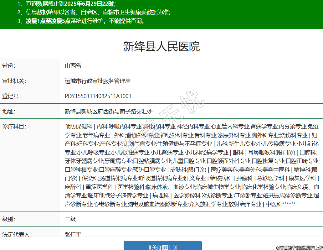 省份:山西省審批機關(guān):運城市行政審批服務(wù)管理局登記號:PDY15501114082511A1001地址:新絳縣新城區(qū)府西街與荀子路交匯處診療科目:預(yù)防保健科 | 內(nèi)科;呼吸內(nèi)科專業(yè);消化內(nèi)科專業(yè);神經(jīng)內(nèi)科專業(yè);心血管內(nèi)科專業(yè);腎病學(xué)專業(yè);內(nèi)分泌專業(yè);免疫學(xué)專業(yè);老年病專業(yè) | 外科;普通外科專業(yè);神經(jīng)外科專業(yè);骨科專業(yè);泌尿外科專業(yè);胸外科專業(yè);燒傷科專業(yè) | 婦產(chǎn)科;婦科專業(yè);產(chǎn)科專業(yè);計劃生育專業(yè);生殖健康與不孕癥專業(yè) | 兒科;新生兒專業(yè);小兒傳染病專業(yè);小兒消化專業(yè);小兒呼吸專業(yè);小兒心臟病專業(yè);小兒腎病專業(yè);小兒神經(jīng)病學(xué)專業(yè) | 眼科 | 耳鼻咽喉科(限門診) | 口腔科;牙體牙髓病專業(yè);牙周病專業(yè);口腔粘膜病專業(yè);兒童口腔專業(yè);口腔頜面外科專業(yè);口腔修復(fù)專業(yè);口腔正畸專業(yè);口腔種植專業(yè);口腔麻醉專業(yè);預(yù)防口腔專業(yè) | 皮膚科(限門診) | 醫(yī)療美容科;美容外科;美容中醫(yī)科 | 精神科(限門診) | 傳染科;腸道傳染病專業(yè);呼吸道傳染病專業(yè);肝炎專業(yè) | 結(jié)核病科 | 腫瘤科 | 急診醫(yī)學(xué)科 | 康復(fù)醫(yī)學(xué)科 | 麻醉科 | 重癥醫(yī)學(xué)科 | 醫(yī)學(xué)檢驗科;臨床體液、血液專業(yè);臨床微生物學(xué)專業(yè);臨床化學(xué)檢驗專業(yè);臨床免疫、血清學(xué)專業(yè);臨床細胞分子遺傳學(xué)專業(yè) | 病理科 | 醫(yī)學(xué)影像科;X線診斷專業(yè);CT診斷專業(yè);磁共振成像診斷專業(yè);超聲診斷專業(yè);心電診斷專業(yè);腦電及腦血流圖診斷專業(yè);介入放射學(xué)專業(yè);放射治療專業(yè) | 中醫(yī)科******級別:二級法定代表人:張仁平主要負責人:張仁平執(zhí)業(yè)許可證有效期:2025/06/03 -至- 2036/08/31 -