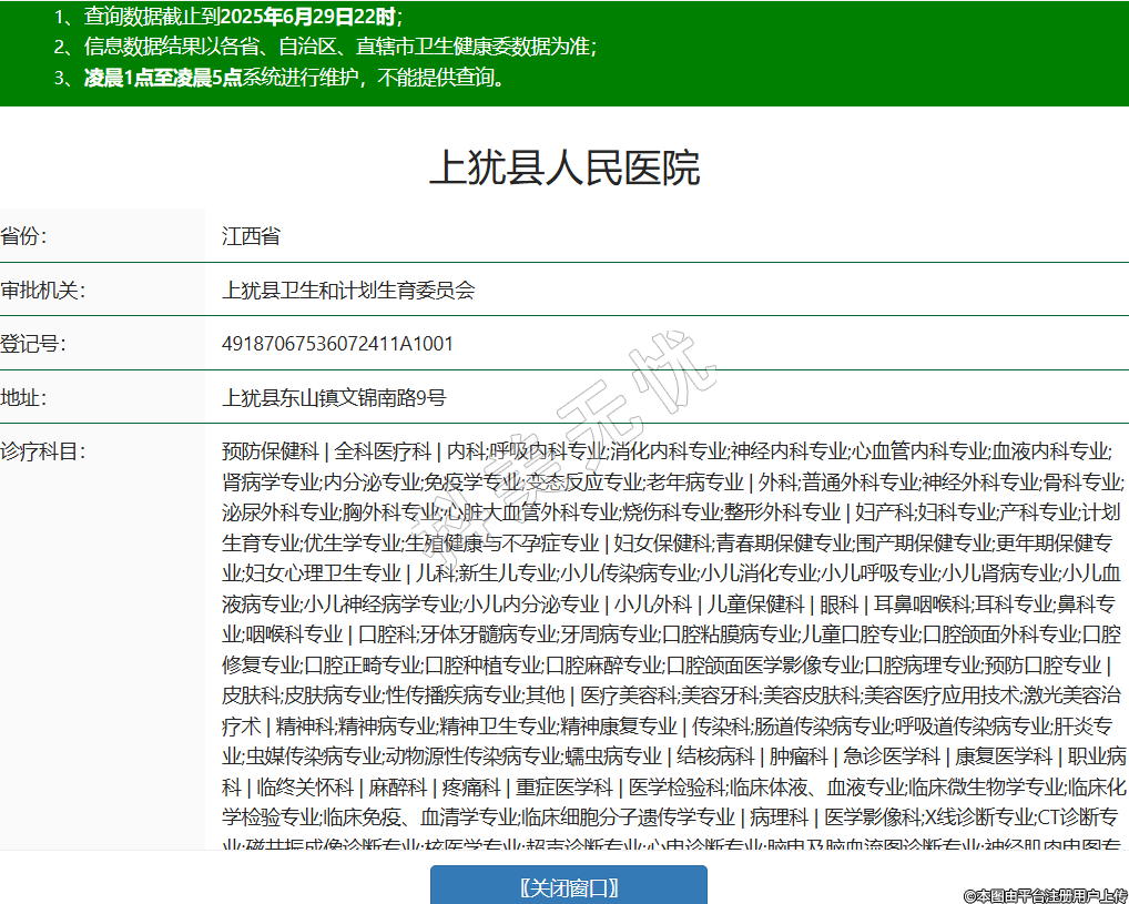 省份:江西省審批機(jī)關(guān):上猶縣衛(wèi)生和計(jì)劃生育委員會(huì)登記號(hào):49187067536072411A1001地址:上猶縣東山鎮(zhèn)文錦南路9號(hào)診療科目:預(yù)防保健科 | 全科醫(yī)療科 | 內(nèi)科;呼吸內(nèi)科專業(yè);消化內(nèi)科專業(yè);神經(jīng)內(nèi)科專業(yè);心血管內(nèi)科專業(yè);血液內(nèi)科專業(yè);腎病學(xué)專業(yè);內(nèi)分泌專業(yè);免疫學(xué)專業(yè);變態(tài)反應(yīng)專業(yè);老年病專業(yè) | 外科;普通外科專業(yè);神經(jīng)外科專業(yè);骨科專業(yè);泌尿外科專業(yè);胸外科專業(yè);心臟大血管外科專業(yè);燒傷科專業(yè);整形外科專業(yè) | 婦產(chǎn)科;婦科專業(yè);產(chǎn)科專業(yè);計(jì)劃生育專業(yè);優(yōu)生學(xué)專業(yè);生殖健康與不孕癥專業(yè) | 婦女保健科;青春期保健專業(yè);圍產(chǎn)期保健專業(yè);更年期保健專業(yè);婦女心理衛(wèi)生專業(yè) | 兒科;新生兒專業(yè);小兒傳染病專業(yè);小兒消化專業(yè);小兒呼吸專業(yè);小兒腎病專業(yè);小兒血液病專業(yè);小兒神經(jīng)病學(xué)專業(yè);小兒內(nèi)分泌專業(yè) | 小兒外科 | 兒童保健科 | 眼科 | 耳鼻咽喉科;耳科專業(yè);鼻科專業(yè);咽喉科專業(yè) | 口腔科;牙體牙髓病專業(yè);牙周病專業(yè);口腔粘膜病專業(yè);兒童口腔專業(yè);口腔頜面外科專業(yè);口腔修復(fù)專業(yè);口腔正畸專業(yè);口腔種植專業(yè);口腔麻醉專業(yè);口腔頜面醫(yī)學(xué)影像專業(yè);口腔病理專業(yè);預(yù)防口腔專業(yè) | 皮膚科;皮膚病專業(yè);性傳播疾病專業(yè);其他 | 醫(yī)療美容科;美容牙科;美容皮膚科;美容醫(yī)療應(yīng)用技術(shù);激光美容治療術(shù) | 精神科;精神病專業(yè);精神衛(wèi)生專業(yè);精神康復(fù)專業(yè) | 傳染科;腸道傳染病專業(yè);呼吸道傳染病專業(yè);肝炎專業(yè);蟲媒傳染病專業(yè);動(dòng)物源性傳染病專業(yè);蠕蟲病專業(yè) | 結(jié)核病科 | 腫瘤科 | 急診醫(yī)學(xué)科 | 康復(fù)醫(yī)學(xué)科 | 職業(yè)病科 | 臨終關(guān)懷科 | 麻醉科 | 疼痛科 | 重癥醫(yī)學(xué)科 | 醫(yī)學(xué)檢驗(yàn)科;臨床體液、血液專業(yè);臨床微生物學(xué)專業(yè);臨床化學(xué)檢驗(yàn)專業(yè);臨床免疫、血清學(xué)專業(yè);臨床細(xì)胞分子遺傳學(xué)專業(yè) | 病理科 | 醫(yī)學(xué)影像科;X線診斷專業(yè);CT診斷專業(yè);磁共振成像診斷專業(yè);核醫(yī)學(xué)專業(yè);超聲診斷專業(yè);心電診斷專業(yè);腦電及腦血流圖診斷專業(yè);神經(jīng)肌肉電圖專業(yè);介入放射學(xué)專業(yè);放射治療專業(yè) | 中醫(yī)科;內(nèi)科專業(yè);外科專業(yè);婦產(chǎn)科專業(yè);兒科專業(yè);皮膚科專業(yè);腫瘤科專業(yè);骨傷科專業(yè);肛腸科專業(yè);老年病科專業(yè);針灸科專業(yè);推拿科專業(yè);康復(fù)醫(yī)學(xué)專業(yè);急診科專業(yè);預(yù)防保健科專業(yè) | 中西醫(yī)結(jié)合科******級(jí)別:三級(jí)法定代表人:蔡聯(lián)劍主要負(fù)責(zé)人:蔡聯(lián)劍執(zhí)業(yè)許可證有效期:2022/11/29 -至- 2027/12/31 -
