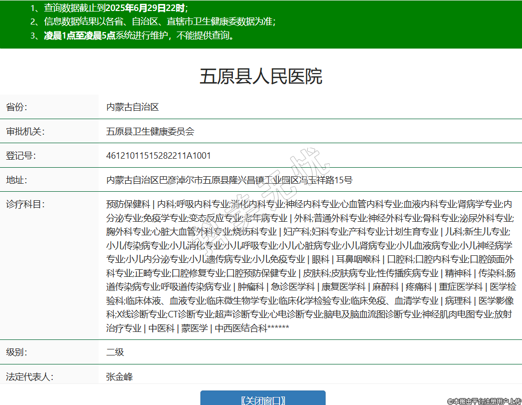 省份:內(nèi)蒙古自治區(qū)審批機(jī)關(guān):五原縣衛(wèi)生健康委員會(huì)登記號(hào):46121011515282211A1001地址:內(nèi)蒙古自治區(qū)巴彥淖爾市五原縣隆興昌鎮(zhèn)工業(yè)園區(qū)馮玉祥路15號(hào)診療科目:預(yù)防保健科 | 內(nèi)科;呼吸內(nèi)科專業(yè);消化內(nèi)科專業(yè);神經(jīng)內(nèi)科專業(yè);心血管內(nèi)科專業(yè);血液內(nèi)科專業(yè);腎病學(xué)專業(yè);內(nèi)分泌專業(yè);免疫學(xué)專業(yè);變態(tài)反應(yīng)專業(yè);老年病專業(yè) | 外科;普通外科專業(yè);神經(jīng)外科專業(yè);骨科專業(yè);泌尿外科專業(yè);胸外科專業(yè);心臟大血管外科專業(yè);燒傷科專業(yè) | 婦產(chǎn)科;婦科專業(yè);產(chǎn)科專業(yè);計(jì)劃生育專業(yè) | 兒科;新生兒專業(yè);小兒傳染病專業(yè);小兒消化專業(yè);小兒呼吸專業(yè);小兒心臟病專業(yè);小兒腎病專業(yè);小兒血液病專業(yè);小兒神經(jīng)病學(xué)專業(yè);小兒內(nèi)分泌專業(yè);小兒遺傳病專業(yè);小兒免疫專業(yè) | 眼科 | 耳鼻咽喉科 | 口腔科;口腔內(nèi)科專業(yè);口腔頜面外科專業(yè);正畸專業(yè);口腔修復(fù)專業(yè);口腔預(yù)防保健專業(yè) | 皮膚科;皮膚病專業(yè);性傳播疾病專業(yè) | 精神科 | 傳染科;腸道傳染病專業(yè);呼吸道傳染病專業(yè) | 腫瘤科 | 急診醫(yī)學(xué)科 | 康復(fù)醫(yī)學(xué)科 | 麻醉科 | 疼痛科 | 重癥醫(yī)學(xué)科 | 醫(yī)學(xué)檢驗(yàn)科;臨床體液、血液專業(yè);臨床微生物學(xué)專業(yè);臨床化學(xué)檢驗(yàn)專業(yè);臨床免疫、血清學(xué)專業(yè) | 病理科 | 醫(yī)學(xué)影像科;X線診斷專業(yè);CT診斷專業(yè);超聲診斷專業(yè);心電診斷專業(yè);腦電及腦血流圖診斷專業(yè);神經(jīng)肌肉電圖專業(yè);放射治療專業(yè) | 中醫(yī)科 | 蒙醫(yī)學(xué) | 中西醫(yī)結(jié)合科******級(jí)別:二級(jí)法定代表人:張金峰主要負(fù)責(zé)人:張金峰執(zhí)業(yè)許可證有效期:2021/01/01 -至- 2025/12/31 -