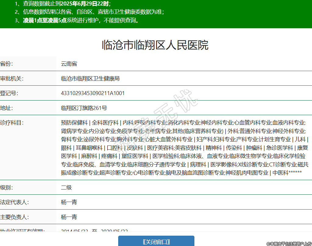 省份:云南省審批機(jī)關(guān):臨滄市臨翔區(qū)衛(wèi)生健康局登記號(hào):43310293453090211A1001地址:臨翔區(qū)汀旗路261號(hào)診療科目:預(yù)防保健科 | 全科醫(yī)療科 | 內(nèi)科;呼吸內(nèi)科專業(yè);消化內(nèi)科專業(yè);神經(jīng)內(nèi)科專業(yè);心血管內(nèi)科專業(yè);血液內(nèi)科專業(yè);腎病學(xué)專業(yè);內(nèi)分泌專業(yè);免疫學(xué)專業(yè);老年病專業(yè);其他(臨床營(yíng)養(yǎng)科專業(yè)) | 外科;普通外科專業(yè);神經(jīng)外科專業(yè);骨科專業(yè);泌尿外科專業(yè);胸外科專業(yè);心臟大血管外科專業(yè) | 婦產(chǎn)科;婦科專業(yè);產(chǎn)科專業(yè);計(jì)劃生育專業(yè) | 兒科 | 眼科 | 耳鼻咽喉科 | 口腔科 | 皮膚科 | 醫(yī)療美容科;美容皮膚科 | 精神科 | 傳染科 | 腫瘤科 | 急診醫(yī)學(xué)科 | 康復(fù)醫(yī)學(xué)科 | 麻醉科 | 疼痛科 | 重癥醫(yī)學(xué)科 | 醫(yī)學(xué)檢驗(yàn)科;臨床體液、血液專業(yè);臨床微生物學(xué)專業(yè);臨床化學(xué)檢驗(yàn)專業(yè);臨床免疫、血清學(xué)專業(yè);臨床細(xì)胞分子遺傳學(xué)專業(yè) | 病理科 | 醫(yī)學(xué)影像科;X線診斷專業(yè);CT診斷專業(yè);磁共振成像診斷專業(yè);超聲診斷專業(yè);心電診斷專業(yè);腦電及腦血流圖診斷專業(yè);神經(jīng)肌肉電圖專業(yè) | 中醫(yī)科******級(jí)別:二級(jí)法定代表人:楊一青主要負(fù)責(zé)人:楊一青執(zhí)業(yè)許可證有效期:2014/05/23 -至- 2029/05/22 -