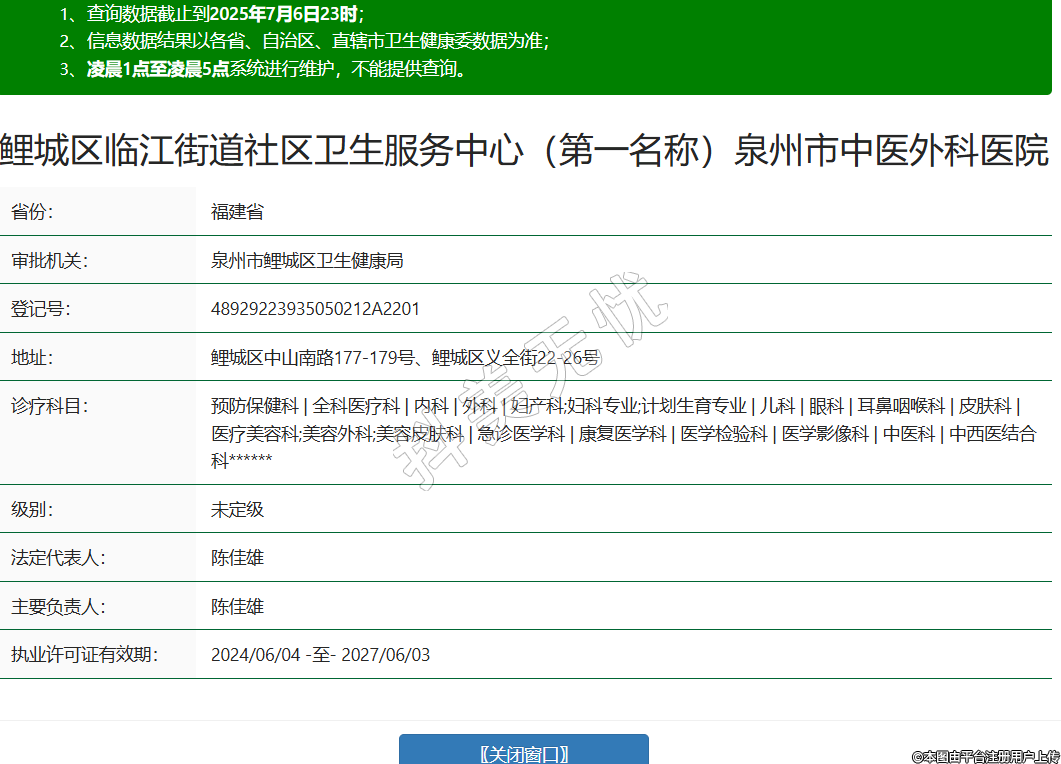 省份:福建省審批機(jī)關(guān):泉州市鯉城區(qū)衛(wèi)生健康局登記號:48929223935050212A2201地址:鯉城區(qū)中山南路177-179號、鯉城區(qū)義全街22-26號診療科目:預(yù)防保健科 | 全科醫(yī)療科 | 內(nèi)科 | 外科 | 婦產(chǎn)科;婦科專業(yè);計劃生育專業(yè) | 兒科 | 眼科 | 耳鼻咽喉科 | 皮膚科 | 醫(yī)療美容科;美容外科;美容皮膚科 | 急診醫(yī)學(xué)科 | 康復(fù)醫(yī)學(xué)科 | 醫(yī)學(xué)檢驗科 | 醫(yī)學(xué)影像科 | 中醫(yī)科 | 中西醫(yī)結(jié)合科******級別:未定級法定代表人:陳佳雄主要負(fù)責(zé)人:陳佳雄執(zhí)業(yè)許可證有效期:2024/06/04 -至- 2027/06/03 -