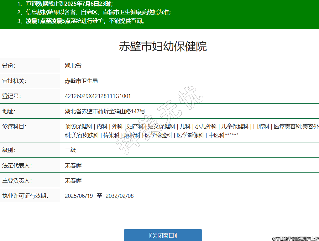 省份:湖北省審批機關:赤壁市衛(wèi)生局登記號:42126029X42128111G1001地址:湖北省赤壁市蒲圻金雞山路147號診療科目:預防保健科 | 內科 | 外科 | 婦產(chǎn)科 | 婦女保健科 | 兒科 | 小兒外科 | 兒童保健科 | 口腔科 | 醫(yī)療美容科;美容外科;美容皮膚科 | 傳染科 | 麻醉科 | 醫(yī)學檢驗科 | 醫(yī)學影像科 | 中醫(yī)科******級別:二級法定代表人:宋春輝主要負責人:宋春輝執(zhí)業(yè)許可證有效期:2025/06/19 -至- 2032/02/08 -