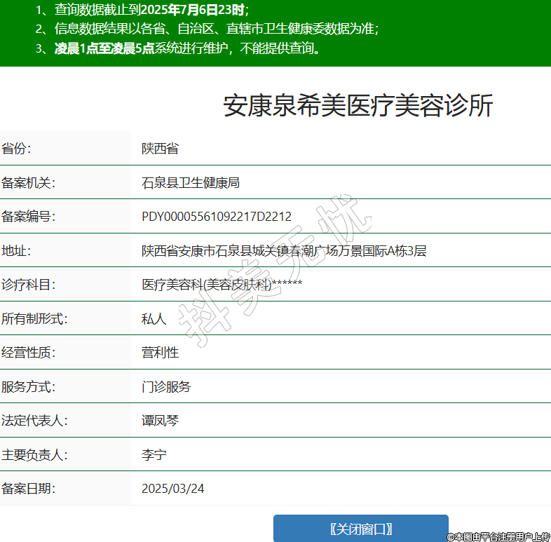 省份:陜西省備案機(jī)關(guān):石泉縣衛(wèi)生健康局備案編號:PDY00005561092217D2212地址:陜西省安康市石泉縣城關(guān)鎮(zhèn)春潮廣場萬景國際A棟3層診療科目:醫(yī)療美容科(美容皮膚科)******所有制形式:私人經(jīng)營性質(zhì):營利性服務(wù)方式:門診服務(wù)法定代表人:譚鳳琴主要負(fù)責(zé)人:李寧備案日期:2025/03/24 -