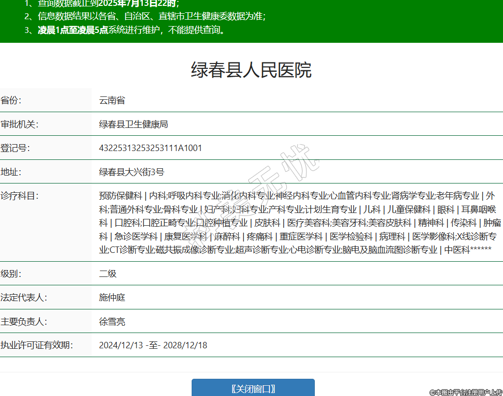 省份:云南省審批機(jī)關(guān):綠春縣衛(wèi)生健康局登記號:43225313253253111A1001地址:綠春縣大興街3號診療科目:預(yù)防保健科 | 內(nèi)科;呼吸內(nèi)科專業(yè);消化內(nèi)科專業(yè);神經(jīng)內(nèi)科專業(yè);心血管內(nèi)科專業(yè);腎病學(xué)專業(yè);老年病專業(yè) | 外科;普通外科專業(yè);骨科專業(yè) | 婦產(chǎn)科;婦科專業(yè);產(chǎn)科專業(yè);計劃生育專業(yè) | 兒科 | 兒童保健科 | 眼科 | 耳鼻咽喉科 | 口腔科;口腔正畸專業(yè);口腔種植專業(yè) | 皮膚科 | 醫(yī)療美容科;美容牙科;美容皮膚科 | 精神科 | 傳染科 | 腫瘤科 | 急診醫(yī)學(xué)科 | 康復(fù)醫(yī)學(xué)科 | 麻醉科 | 疼痛科 | 重癥醫(yī)學(xué)科 | 醫(yī)學(xué)檢驗科 | 病理科 | 醫(yī)學(xué)影像科;X線診斷專業(yè);CT診斷專業(yè);磁共振成像診斷專業(yè);超聲診斷專業(yè);心電診斷專業(yè);腦電及腦血流圖診斷專業(yè) | 中醫(yī)科******級別:二級法定代表人:施仲庭主要負(fù)責(zé)人:徐雪亮執(zhí)業(yè)許可證有效期:2024/12/13 -至- 2028/12/18 -