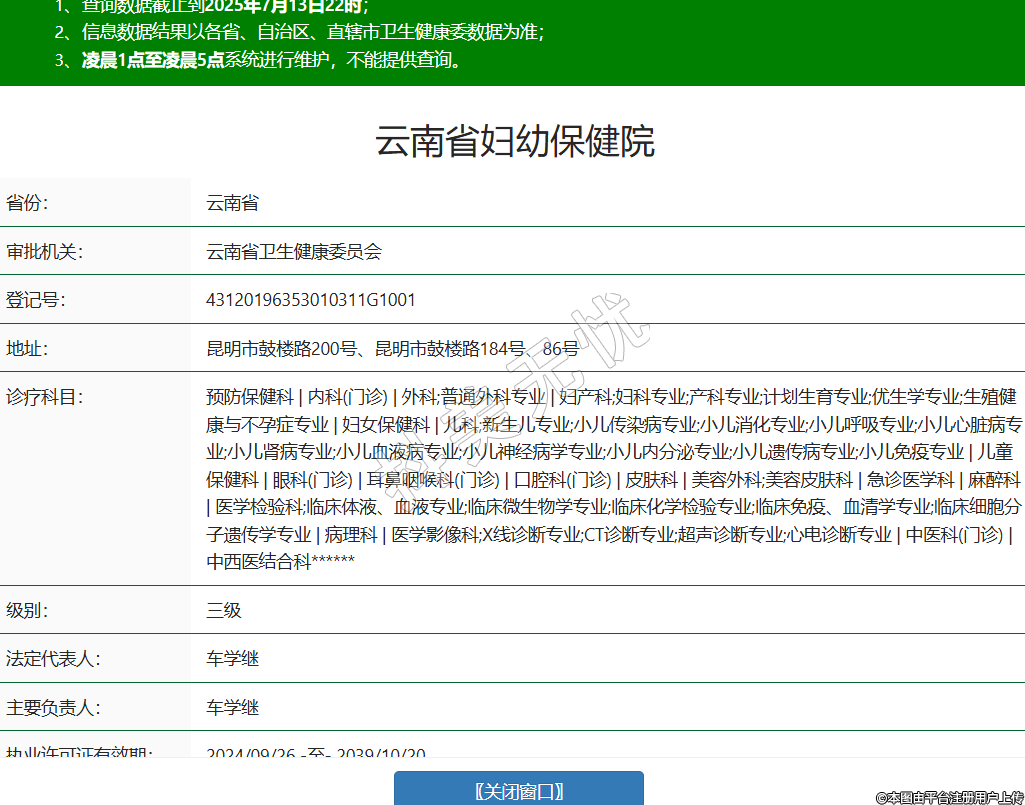 省份:云南省審批機關:云南省衛(wèi)生健康委員會登記號:43120196353010311G1001地址:昆明市鼓樓路200號、昆明市鼓樓路184號、86號診療科目:預防保健科 | 內(nèi)科(門診) | 外科;普通外科專業(yè) | 婦產(chǎn)科;婦科專業(yè);產(chǎn)科專業(yè);計劃生育專業(yè);優(yōu)生學專業(yè);生殖健康與不孕癥專業(yè) | 婦女保健科 | 兒科;新生兒專業(yè);小兒傳染病專業(yè);小兒消化專業(yè);小兒呼吸專業(yè);小兒心臟病專業(yè);小兒腎病專業(yè);小兒血液病專業(yè);小兒神經(jīng)病學專業(yè);小兒內(nèi)分泌專業(yè);小兒遺傳病專業(yè);小兒免疫專業(yè) | 兒童保健科 | 眼科(門診) | 耳鼻咽喉科(門診) | 口腔科(門診) | 皮膚科 | 美容外科;美容皮膚科 | 急診醫(yī)學科 | 麻醉科 | 醫(yī)學檢驗科;臨床體液、血液專業(yè);臨床微生物學專業(yè);臨床化學檢驗專業(yè);臨床免疫、血清學專業(yè);臨床細胞分子遺傳學專業(yè) | 病理科 | 醫(yī)學影像科;X線診斷專業(yè);CT診斷專業(yè);超聲診斷專業(yè);心電診斷專業(yè) | 中醫(yī)科(門診) | 中西醫(yī)結合科******級別:三級法定代表人:車學繼主要負責人:車學繼執(zhí)業(yè)許可證有效期:2024/09/26 -至- 2039/10/20 -