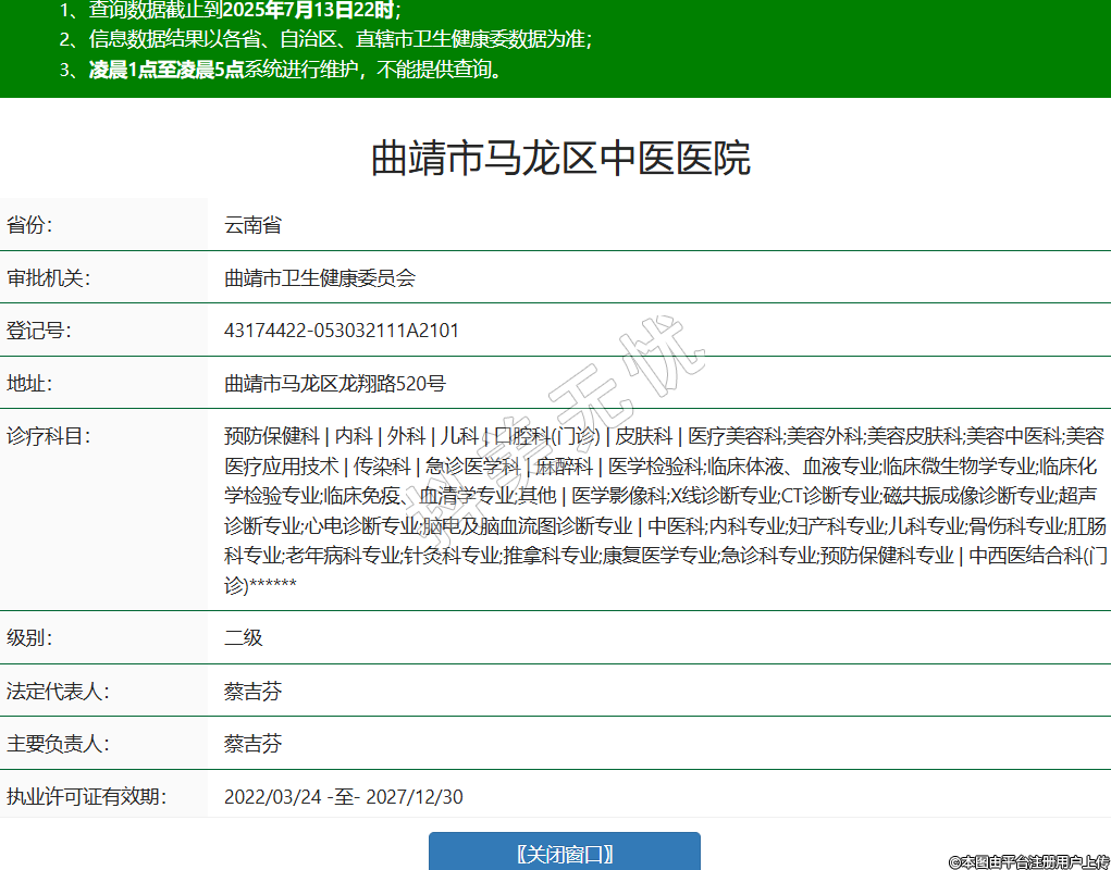 省份:云南省審批機關(guān):曲靖市衛(wèi)生健康委員會登記號:43174422-053032111A2101地址:曲靖市馬龍區(qū)龍翔路520號診療科目:預(yù)防保健科 | 內(nèi)科 | 外科 | 兒科 | 口腔科(門診) | 皮膚科 | 醫(yī)療美容科;美容外科;美容皮膚科;美容中醫(yī)科;美容醫(yī)療應(yīng)用技術(shù) | 傳染科 | 急診醫(yī)學(xué)科 | 麻醉科 | 醫(yī)學(xué)檢驗科;臨床體液、血液專業(yè);臨床微生物學(xué)專業(yè);臨床化學(xué)檢驗專業(yè);臨床免疫、血清學(xué)專業(yè);其他 | 醫(yī)學(xué)影像科;X線診斷專業(yè);CT診斷專業(yè);磁共振成像診斷專業(yè);超聲診斷專業(yè);心電診斷專業(yè);腦電及腦血流圖診斷專業(yè) | 中醫(yī)科;內(nèi)科專業(yè);婦產(chǎn)科專業(yè);兒科專業(yè);骨傷科專業(yè);肛腸科專業(yè);老年病科專業(yè);針灸科專業(yè);推拿科專業(yè);康復(fù)醫(yī)學(xué)專業(yè);急診科專業(yè);預(yù)防保健科專業(yè) | 中西醫(yī)結(jié)合科(門診)******級別:二級法定代表人:蔡吉芬主要負(fù)責(zé)人:蔡吉芬執(zhí)業(yè)許可證有效期:2022/03/24 -至- 2027/12/30 -