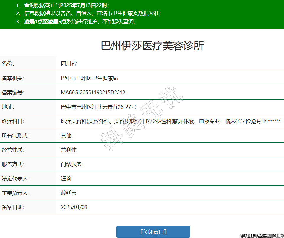 省份:四川省備案機(jī)關(guān):巴中市巴州區(qū)衛(wèi)生健康局備案編號:MA66GJ20551190215D2212地址:巴中市巴州區(qū)江北云景巷26-27號診療科目:醫(yī)療美容科(美容外科、美容皮膚科) | 醫(yī)學(xué)檢驗(yàn)科(臨床體液、血液專業(yè)、臨床化學(xué)檢驗(yàn)專業(yè))******所有制形式:其他經(jīng)營性質(zhì):營利性服務(wù)方式:門診服務(wù)法定代表人:汪莉主要負(fù)責(zé)人:賴廷玉備案日期:2025/01/08 -