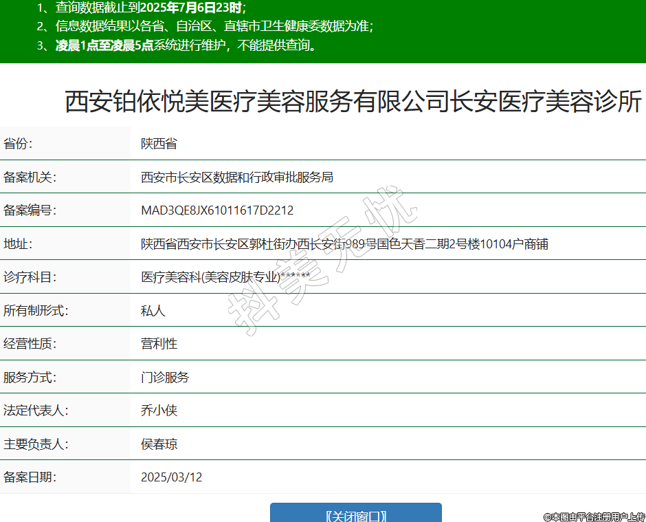 省份:陜西省備案機(jī)關(guān):西安市長(zhǎng)安區(qū)數(shù)據(jù)和行政審批服務(wù)局備案編號(hào):MAD3QE8JX61011617D2212地址:陜西省西安市長(zhǎng)安區(qū)郭杜街辦西長(zhǎng)安街989號(hào)國(guó)色天香二期2號(hào)樓10104戶商鋪診療科目:醫(yī)療美容科(美容皮膚專業(yè))******所有制形式:私人經(jīng)營(yíng)性質(zhì):營(yíng)利性服務(wù)方式:門診服務(wù)法定代表人:喬小俠主要負(fù)責(zé)人:侯春瓊備案日期:2025/03/12 -