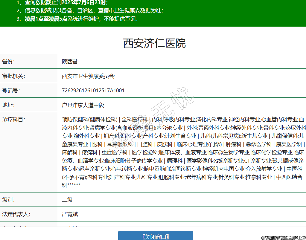 省份:陜西省審批機(jī)關(guān):西安市衛(wèi)生健康委員會登記號:72629261261012517A1001地址:戶縣灃京大道中段診療科目:預(yù)防保健科(健康體檢科) | 全科醫(yī)療科 | 內(nèi)科;呼吸內(nèi)科專業(yè);消化內(nèi)科專業(yè);神經(jīng)內(nèi)科專業(yè);心血管內(nèi)科專業(yè);血液內(nèi)科專業(yè);腎病學(xué)專業(yè)(含血液透析項(xiàng)目);內(nèi)分泌專業(yè) | 外科;普通外科專業(yè);神經(jīng)外科專業(yè);骨科專業(yè);泌尿外科專業(yè);胸外科專業(yè) | 婦產(chǎn)科;婦科專業(yè);產(chǎn)科專業(yè);計劃生育專業(yè) | 兒科(兒科常見病);新生兒專業(yè) | 兒童保健科;兒童康復(fù)專業(yè) | 眼科 | 耳鼻咽喉科 | 口腔科 | 皮膚科 | 臨床心理專業(yè)(門診) | 腫瘤科 | 急診醫(yī)學(xué)科 | 康復(fù)醫(yī)學(xué)科 | 麻醉科 | 疼痛科 | 重癥醫(yī)學(xué)科 | 醫(yī)學(xué)檢驗(yàn)科;臨床體液、血液專業(yè);臨床微生物學(xué)專業(yè);臨床化學(xué)檢驗(yàn)專業(yè);臨床免疫、血清學(xué)專業(yè);臨床細(xì)胞分子遺傳學(xué)專業(yè) | 病理科 | 醫(yī)學(xué)影像科;X線診斷專業(yè);CT診斷專業(yè);磁共振成像診斷專業(yè);超聲診斷專業(yè);心電診斷專業(yè);腦電及腦血流圖診斷專業(yè);神經(jīng)肌肉電圖專業(yè);介入放射學(xué)專業(yè) | 中醫(yī)科(不孕不育);內(nèi)科專業(yè);婦產(chǎn)科專業(yè);兒科專業(yè);肛腸科專業(yè);老年病科專業(yè);針灸科專業(yè);推拿科專業(yè) | 中西醫(yī)結(jié)合科******級別:二級法定代表人:嚴(yán)育斌主要負(fù)責(zé)人:嚴(yán)育斌執(zhí)業(yè)許可證有效期:2023/10/30 -至- 2038/10/30 -
