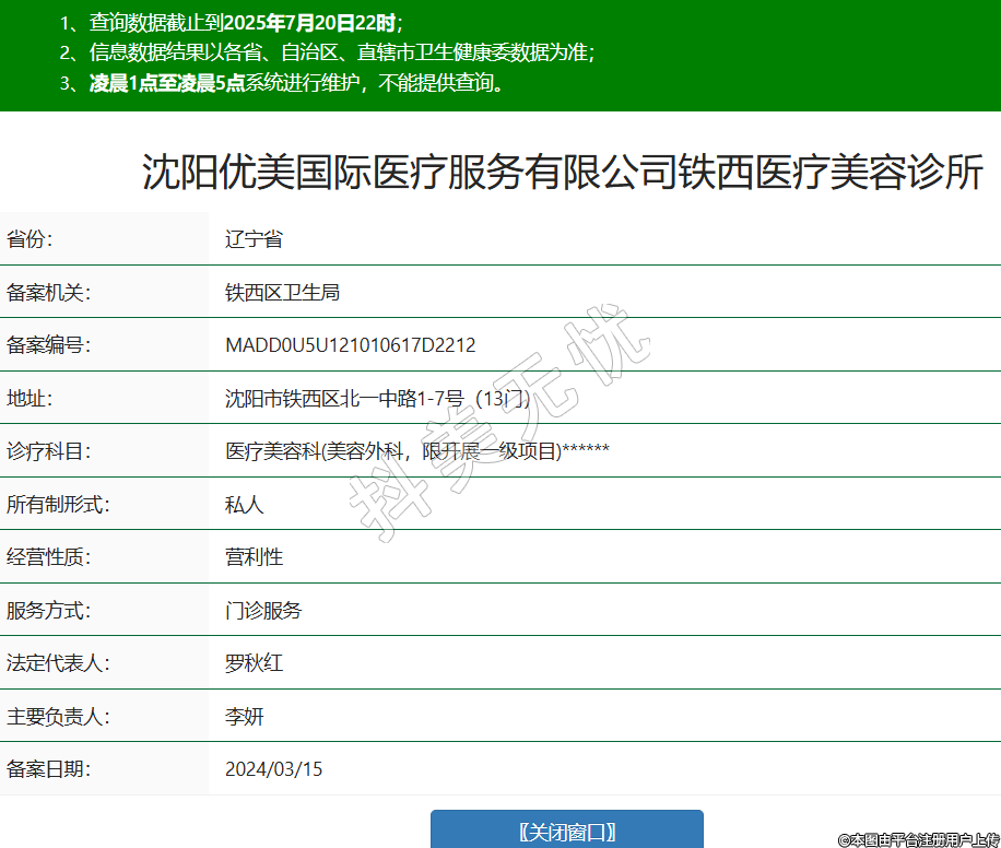 沈陽優(yōu)美國際醫(yī)療服務(wù)有限公司鐵西醫(yī)療美容診所,診療科目:醫(yī)療美容科(美容外科,限開展一級項目)******