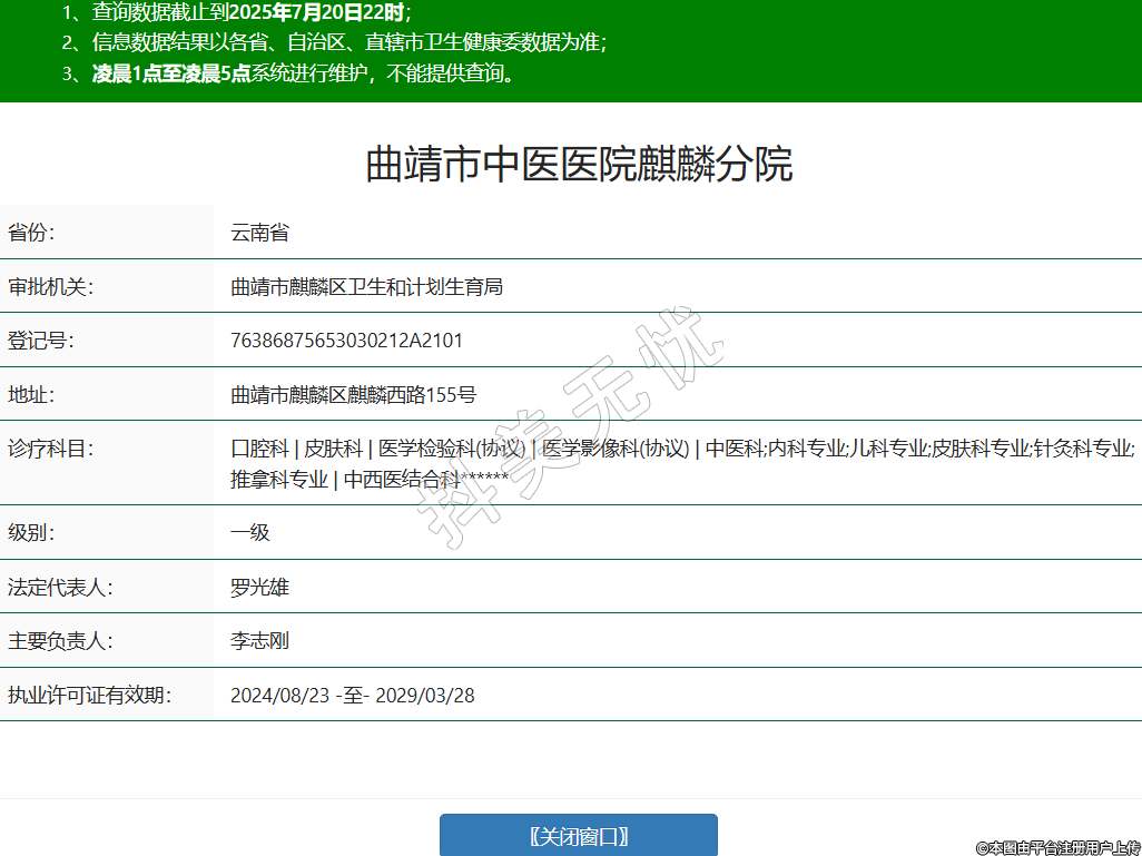 省份:云南省審批機關:曲靖市麒麟?yún)^(qū)衛(wèi)生和計劃生育局登記號:76386875653030212A2101地址:曲靖市麒麟?yún)^(qū)麒麟西路155號診療科目:口腔科 | 皮膚科 | 醫(yī)學檢驗科(協(xié)議) | 醫(yī)學影像科(協(xié)議) | 中醫(yī)科;內科專業(yè);兒科專業(yè);皮膚科專業(yè);針灸科專業(yè);推拿科專業(yè) | 中西醫(yī)結合科******級別:一級法定代表人:羅光雄主要負責人:李志剛執(zhí)業(yè)許可證有效期:2024/08/23 -至- 2029/03/28 -