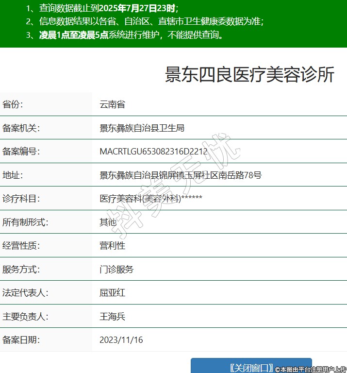 省份:云南省備案機(jī)關(guān):景東彝族自治縣衛(wèi)生局備案編號:MACRTLGU653082316D2212地址:景東彝族自治縣錦屏鎮(zhèn)玉屏社區(qū)南岳路78號診療科目:醫(yī)療美容科(美容外科)******所有制形式:其他經(jīng)營性質(zhì):營利性服務(wù)方式:門診服務(wù)法定代表人:屈亞紅主要負(fù)責(zé)人:王海兵備案日期:2023/11/16 -