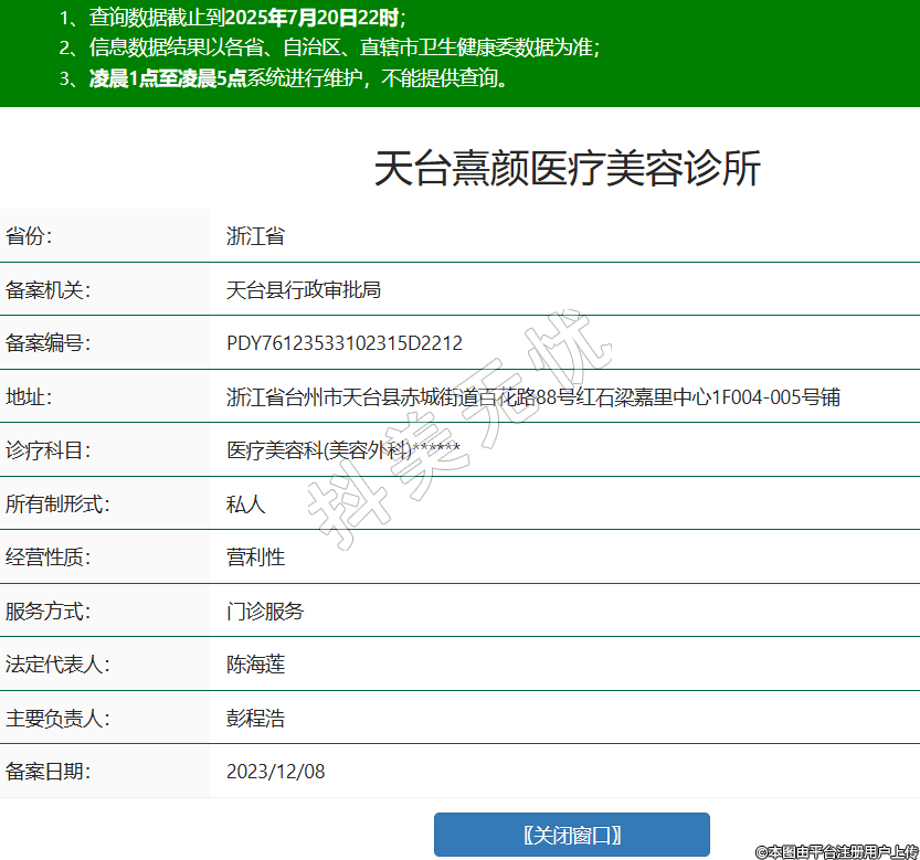 省份:浙江省備案機關(guān):天臺縣行政審批局備案編號:PDY76123533102315D2212地址:浙江省臺州市天臺縣赤城街道百花路88號紅石梁嘉里中心1F004-005號鋪診療科目:醫(yī)療美容科(美容外科)******所有制形式:私人經(jīng)營性質(zhì):營利性服務(wù)方式:門診服務(wù)法定代表人:陳海蓮主要負(fù)責(zé)人:彭程浩備案日期:2023/12/08 -